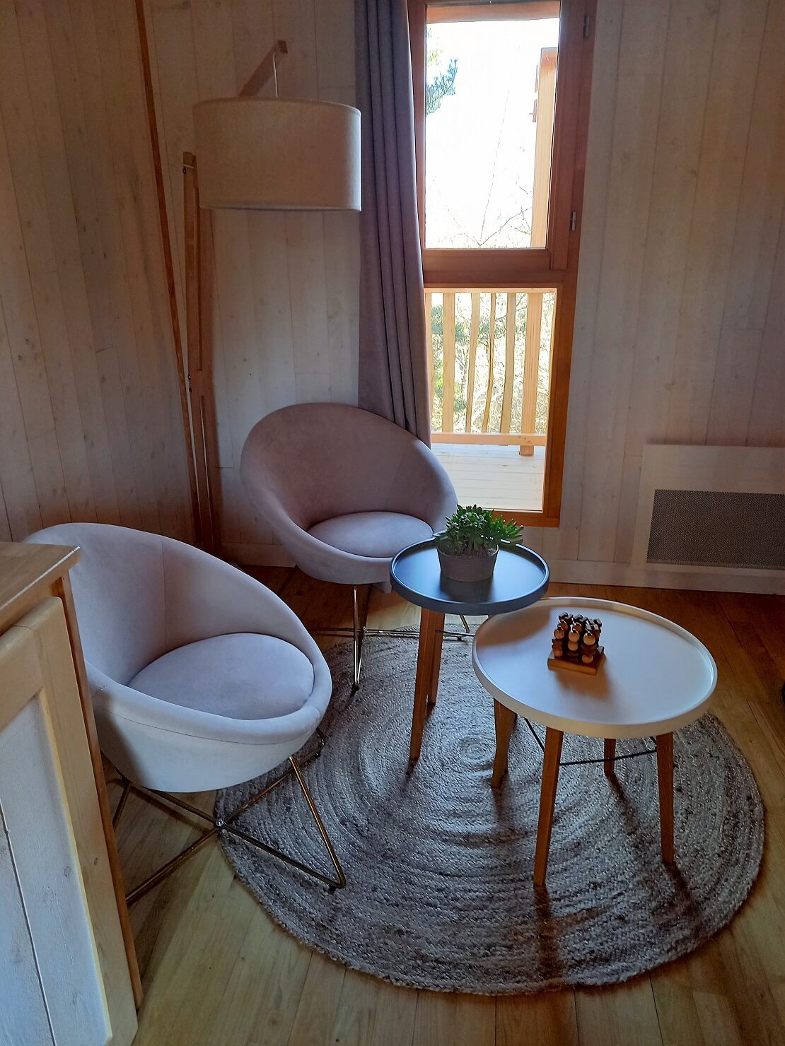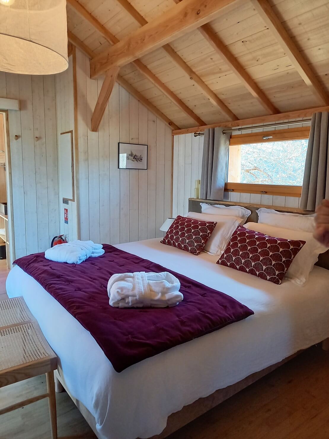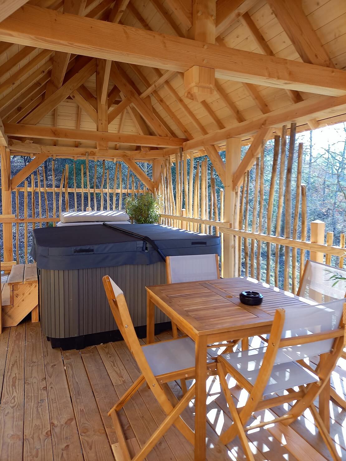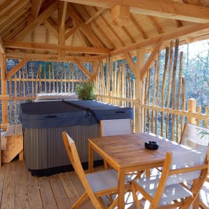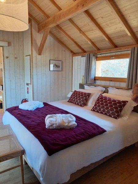 À notre arrivée, nous avons été émerveillés par cet hébergement unique : des cabanes en bois perchées dans les arbres, offrant une vue imprenable sur la campagne environnante. En accédant à notre cabane par un escalier, nous avons découvert une chambre accueillante, un coin cuisine bien équipé et une salle de bain moderne. Tout est à la hauteur d’un établissement 4 étoiles ! Et pour couronner le tout, une terrasse avec un spa privatif rien que pour nous… Oh là là, quel bonheur !