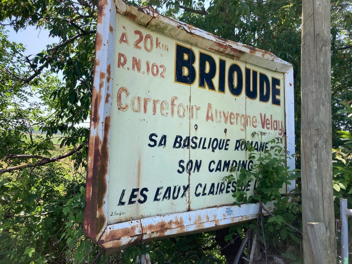 Plutôt discret, en partie dissimulé par les ramures d’un arbre et un poteau en bois, le respectable panneau promotionnel de Brioude tient toujours la route, quelque part entre Saint-Germain-Lembron et Lempdes-sur-Allagnon