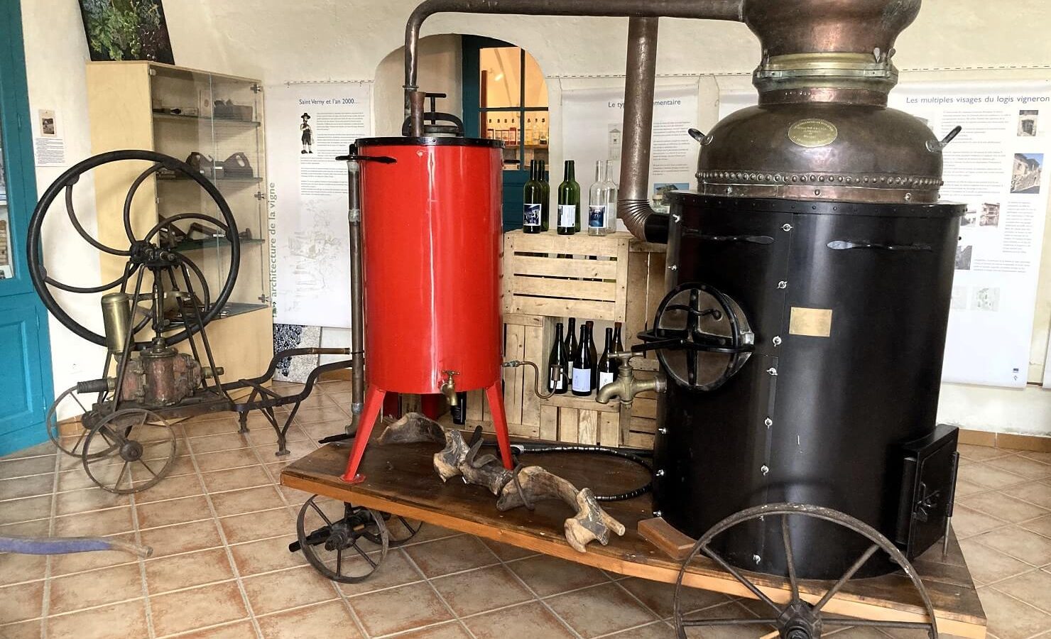 En parallèle, le matériel nécessaire au travail de la vigne, aux vendanges et à la vinification se découvre en empruntant les terrasses de l’ancien jardin du curé avec vue sur l’Allier et le pont.  Tout y est : la vigne, la cabane, le matériel, les caves, le cuvage, l’alambic…