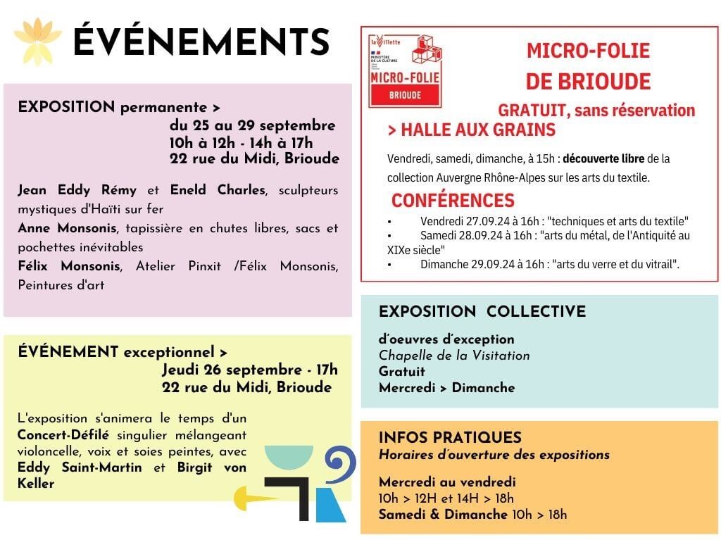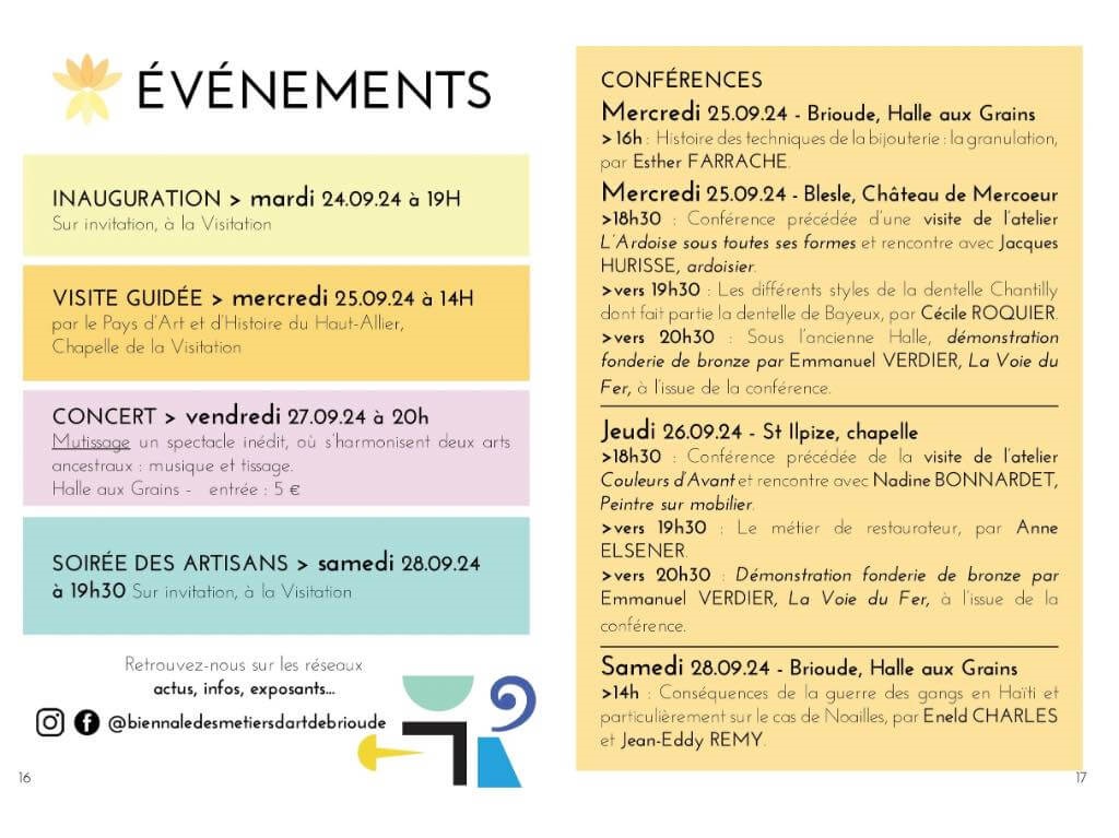 Organisée par l’Office de tourisme, du commerce et de l’artisanat de Brioude sud Auvergne avec le soutien de plusieurs partenaires, la Biennale des métiers d’art propose en parallèle toute une palette d’animations entre conférences, stages, ateliers, démonstrations et un concert vendredi à 20 heures à la Halle aux grains, un spectacle inédit où s’harmonisent deux arts ancestraux : musique et tissage (entrée : 5 €). Les rendez-vous dans le détail sur la page Facebook @biennaledesmetiersdartdebrioude