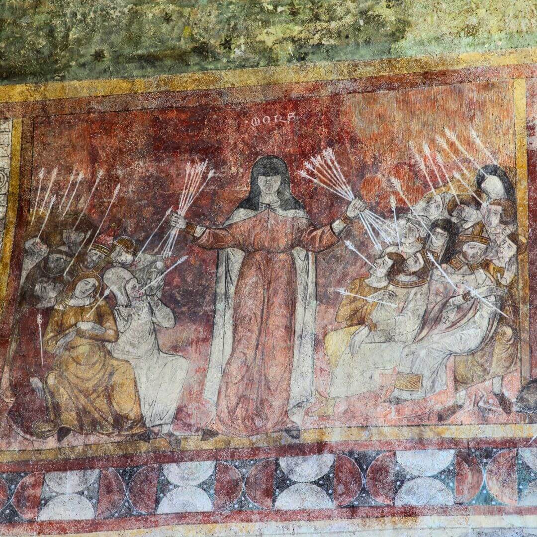 L’ancien réfectoire, qui a servi un temps de grange à foin, abrite une fresque monumentale de la fin du XIIe siècle incroyablement préservée. D’influence byzantine et copte, elle représente un Christ tétramorphe en majesté et, plus remarquable, une Vierge couronnée en majesté accompagnée des apôtres.