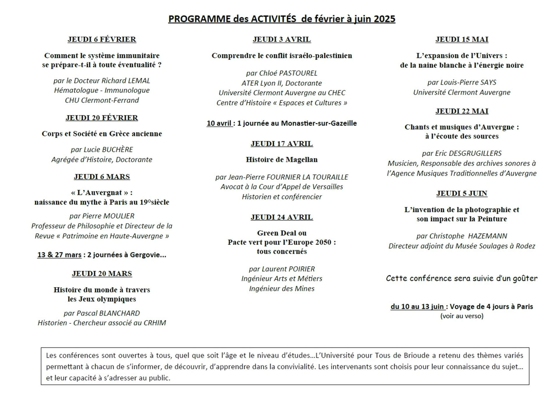 L'Université pour Tous de Brioude présente son programme de février à juin 2026 : 10 conférences sur des sujets variés (écologie, histoire locale, sciences...), le jeudi de 14h30 à 16h30, à la Halle aux Grains.
