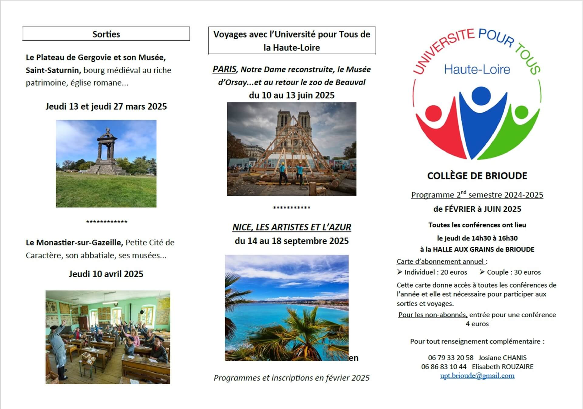 L'Université pour Tous de Brioude présente son programme de février à juin 2026 : 10 conférences sur des sujets variés (écologie, histoire locale, sciences...), le jeudi de 14h30 à 16h30, à la Halle aux Grains.
