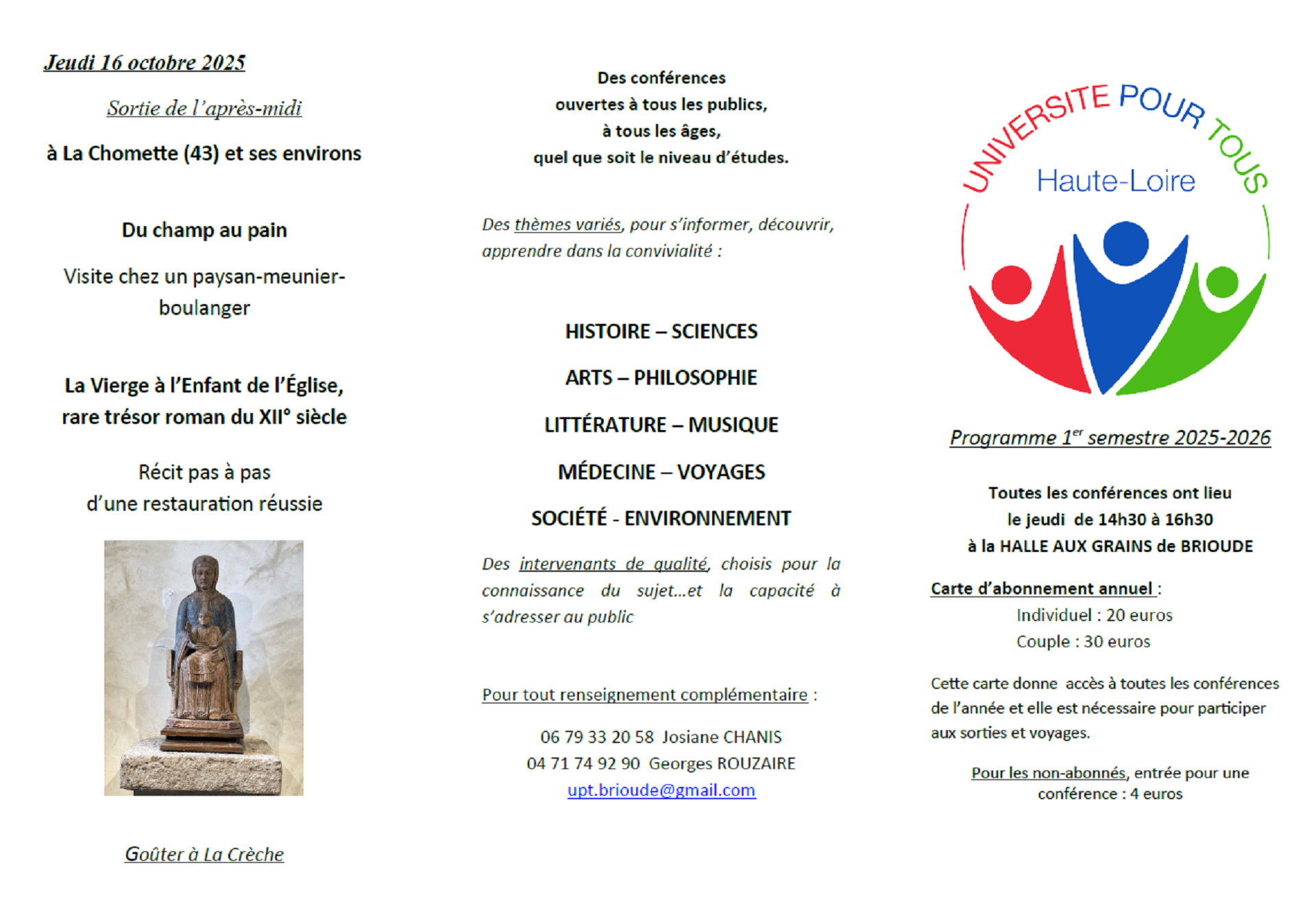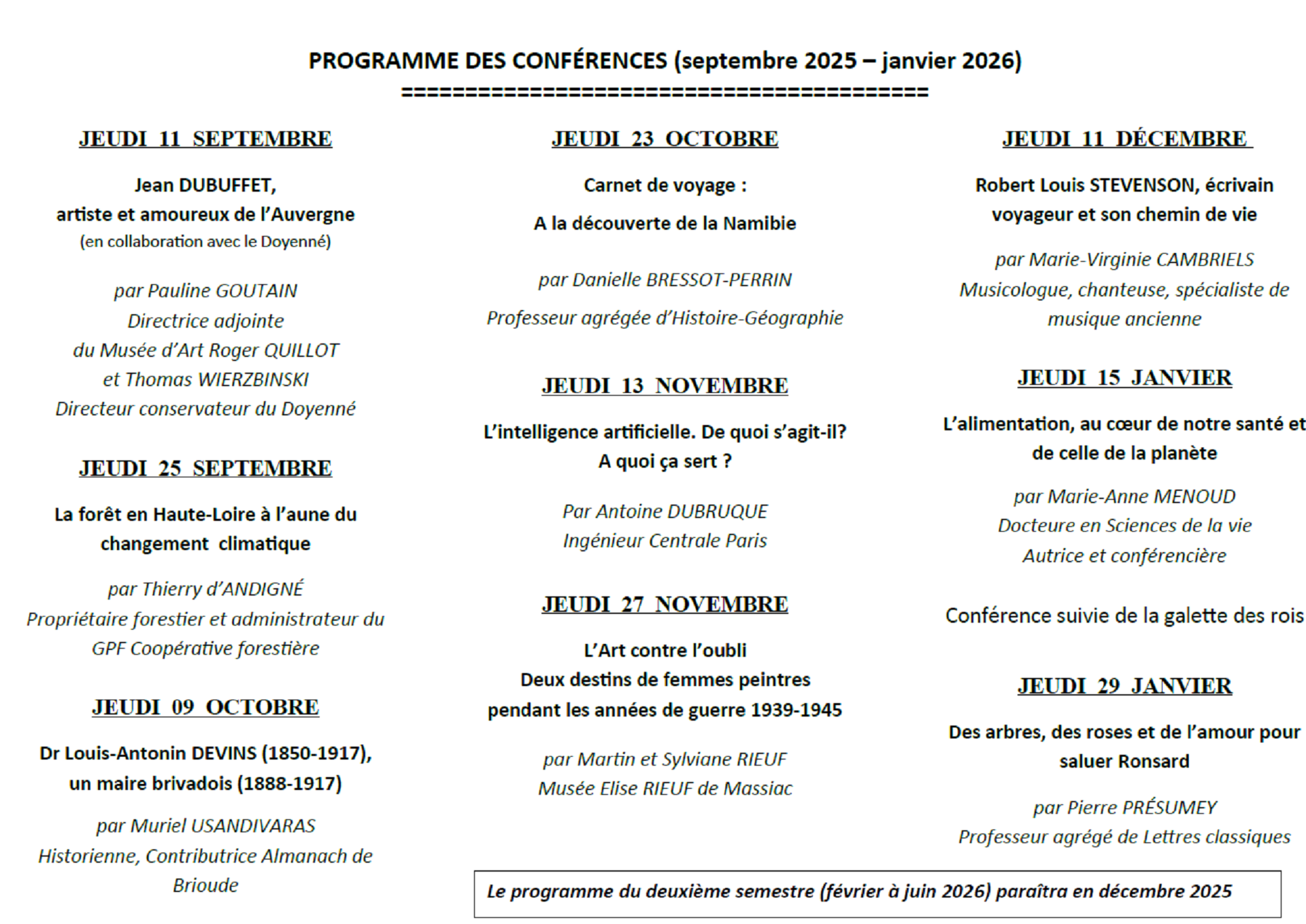 L'Université pour Tous de Brioude présente son programme de septembre 2025 à janvier 2026 : 8 conférences sur des sujets variés (écologie, histoire locale, sciences...), le jeudi de 14h30 à 16h30, à la Halle aux Grains.