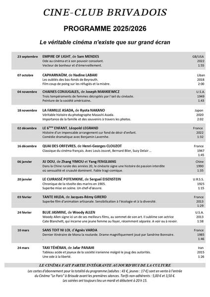 Les cartes d'abonnement pour la totalité du programme (adultes : 43 €, jeunes : 17 €) sont en vente à l'entrée du Cinéma "Le Paris" à Brioude avant les premières séances.
