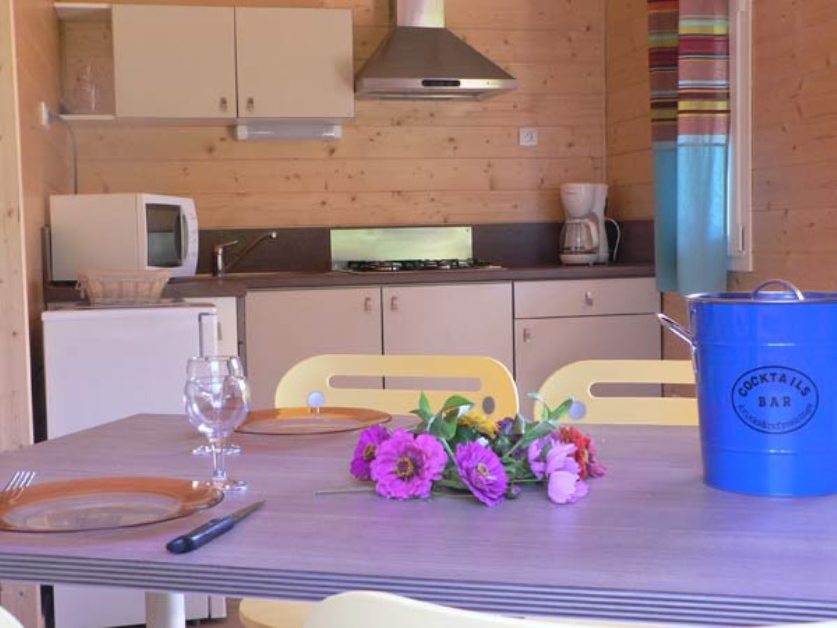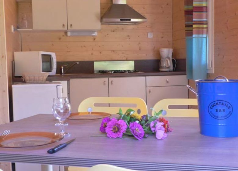 – d’un espace cuisine avec micro onde, frigo/congélateur, cafetière électrique, vaisselle, barbecue au charbon de bois, table, chaises et un chariot déplaçable équipé de 2 plaques de cuisson gaz, idéal pour préparer vos plats à l’extérieur de votre tente.