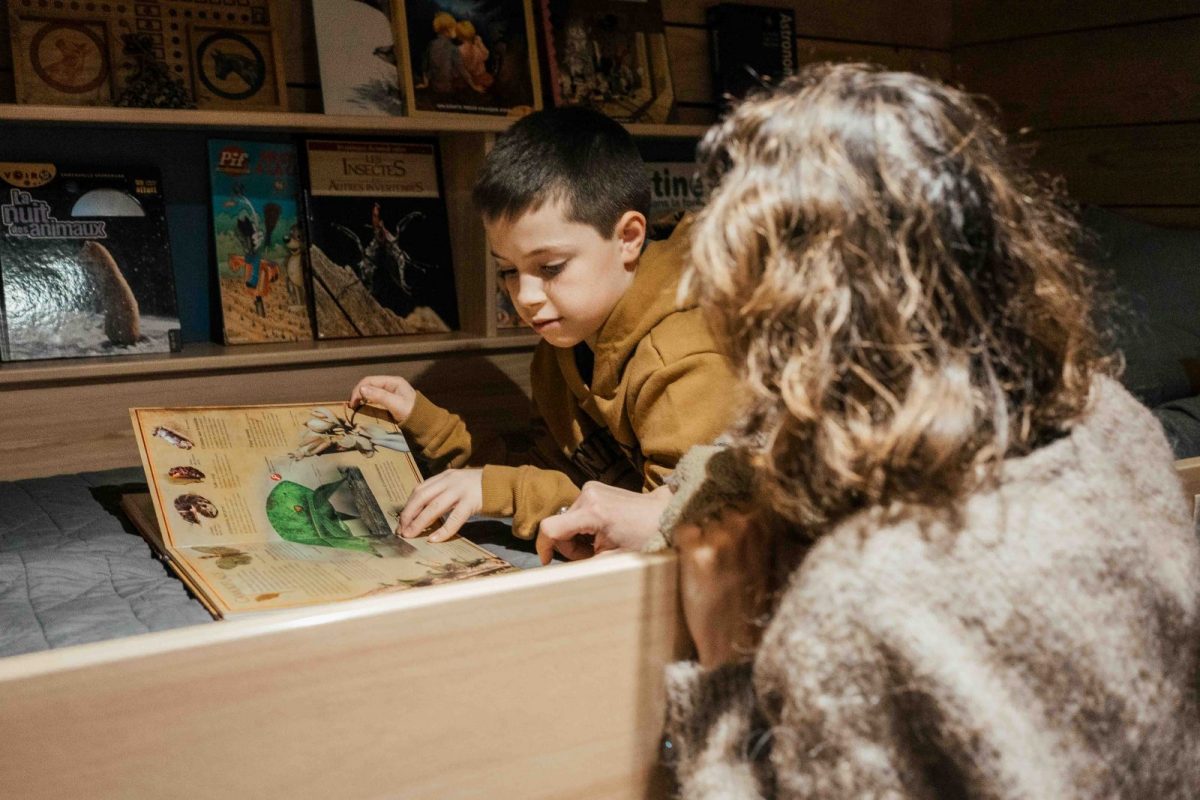 L'hébergement est complètement adapté aux enfants : chambre-cabane pour qu'ils aient leur indépendance, petit lavabo à leur hauteur dans la salle de bains, chaises haute et rehausseur fournis, jeux rétro et livres, etc. Et pour les activités extérieures : un circuit de balade court au départ de la maison, un livret-jeu autour du thème de la forêt pour apprendre en s'amusant, une aire de jeu rétro-récup et un jeu de piste dans le hameau, pour jouer au détective tout en découvrant les lieux.