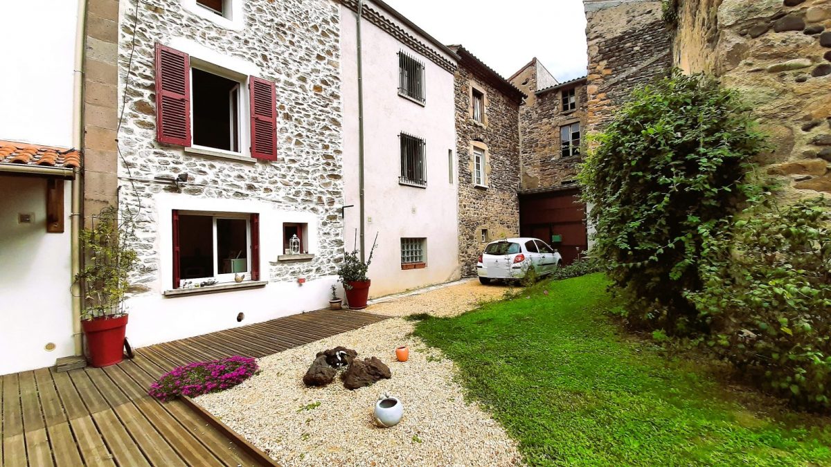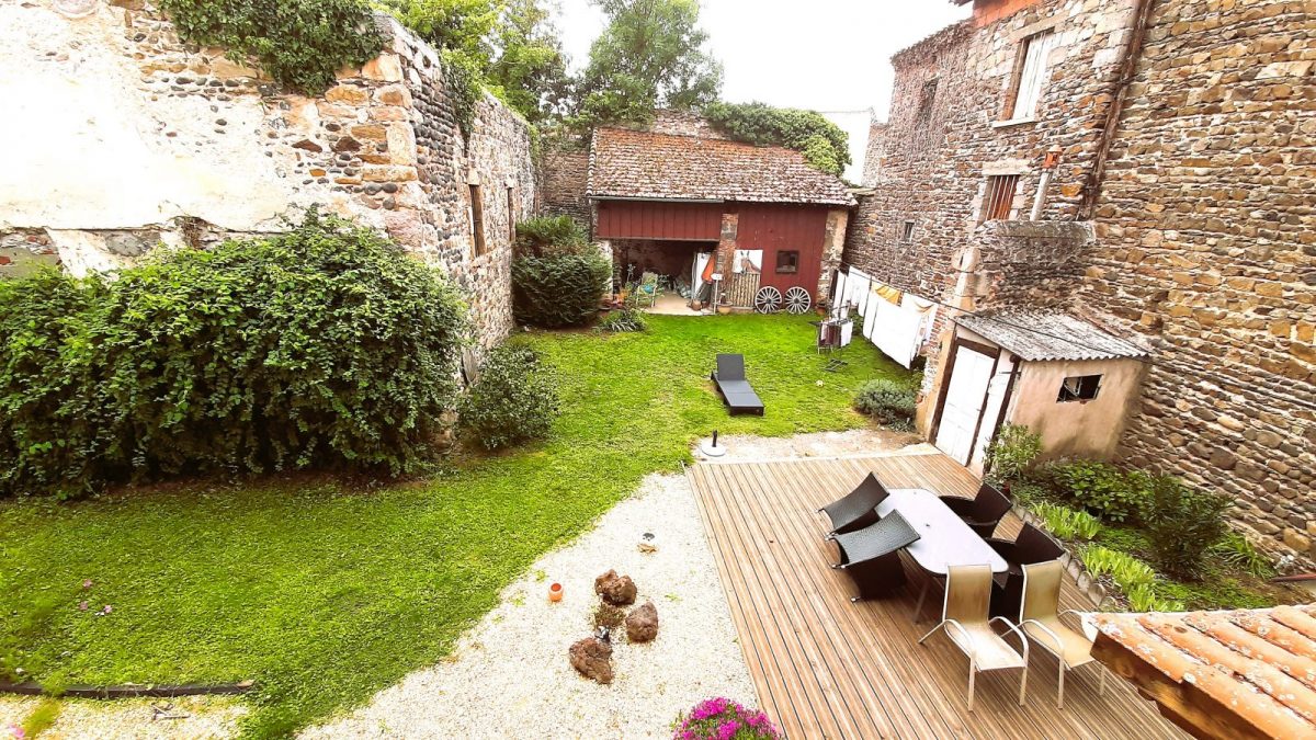 Cour fermée, engazonnée et fleurie à la belle saison.
