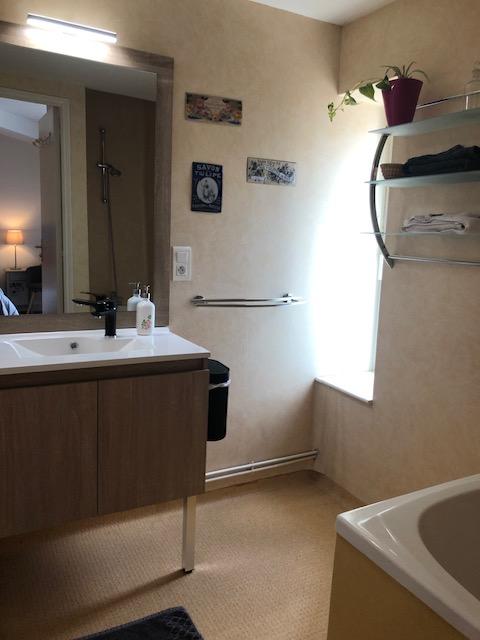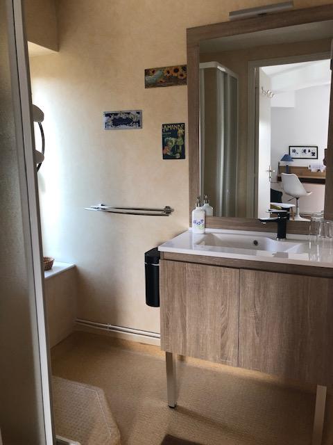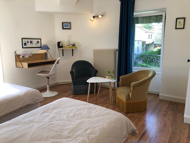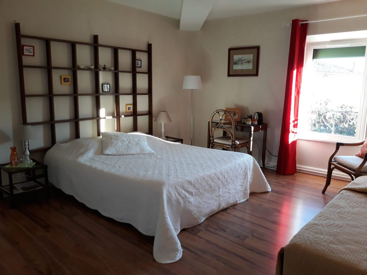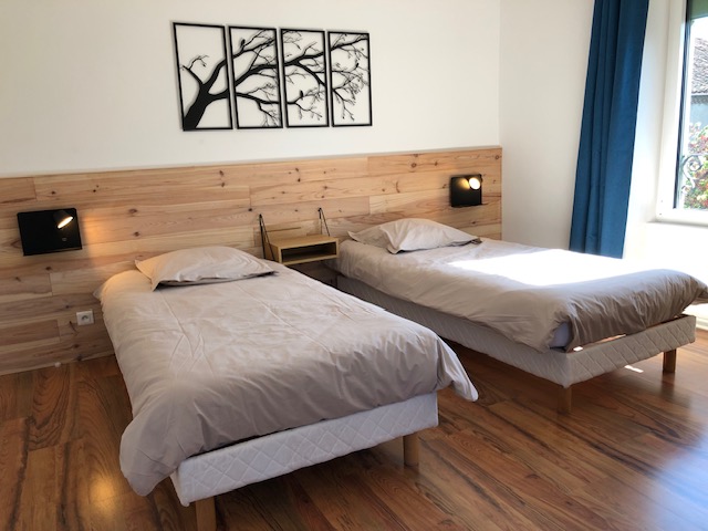 Chambre en rez de jardin. Un grand lit de 160 + 1 lit une personne pour accompagnant. Douche et Toilettes adaptées.