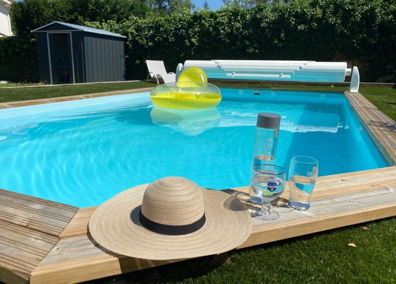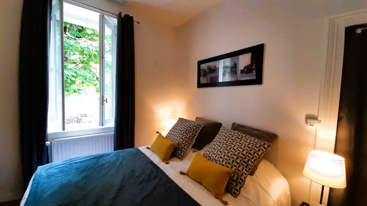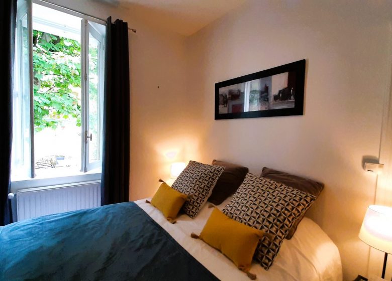 → Chambre orientée ouest, donnant sur le jardin et réservée aux hôtes : un lit deux personnes en 160x200 cm (lit Queen size), bonnetière, portant avec cintres, … Literie de qualité neuve.