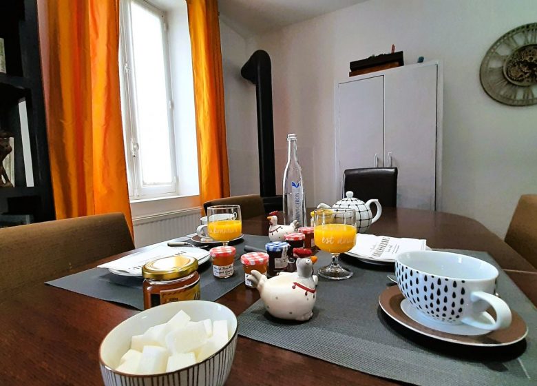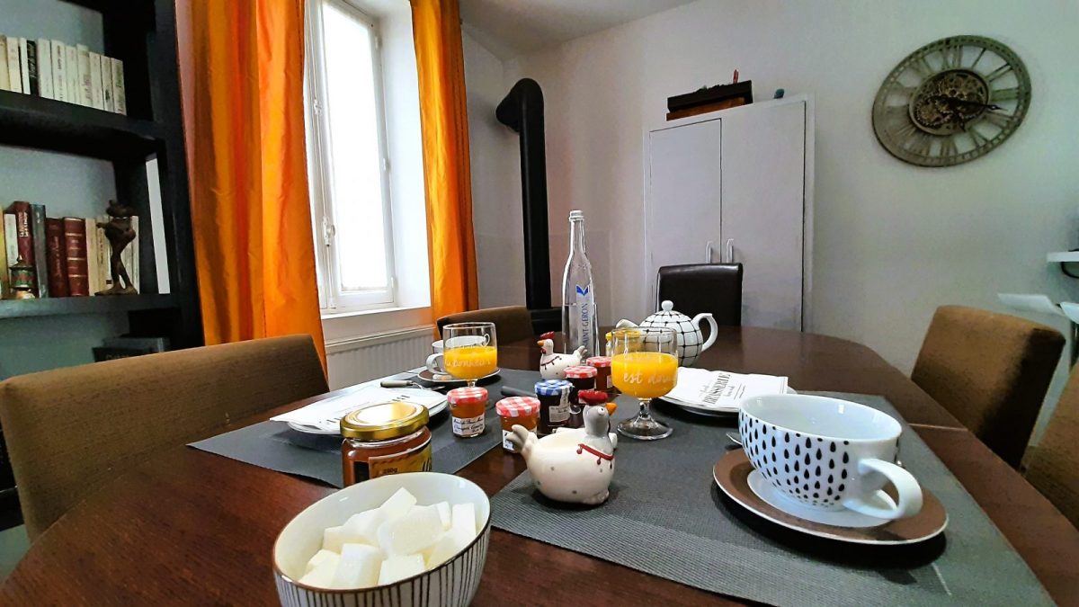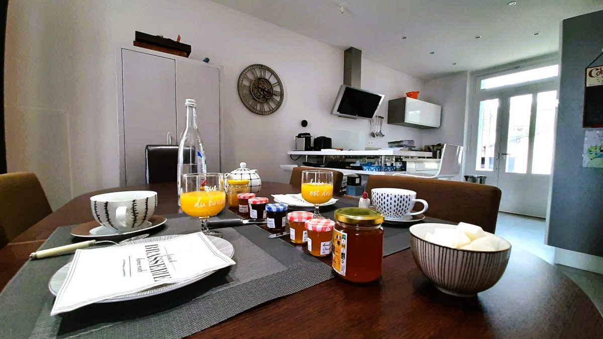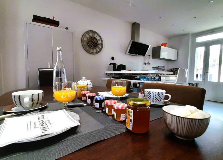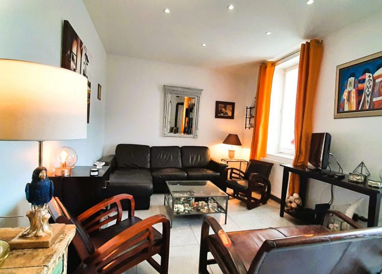 → Pièce de vie (séjour-cuisine) partagée avec la propriétaire : cuisine équipée et espace salle à manger où sont servis les petits déjeuners, coin détente avec canapés, fauteuils, bibliothèque, TV, …