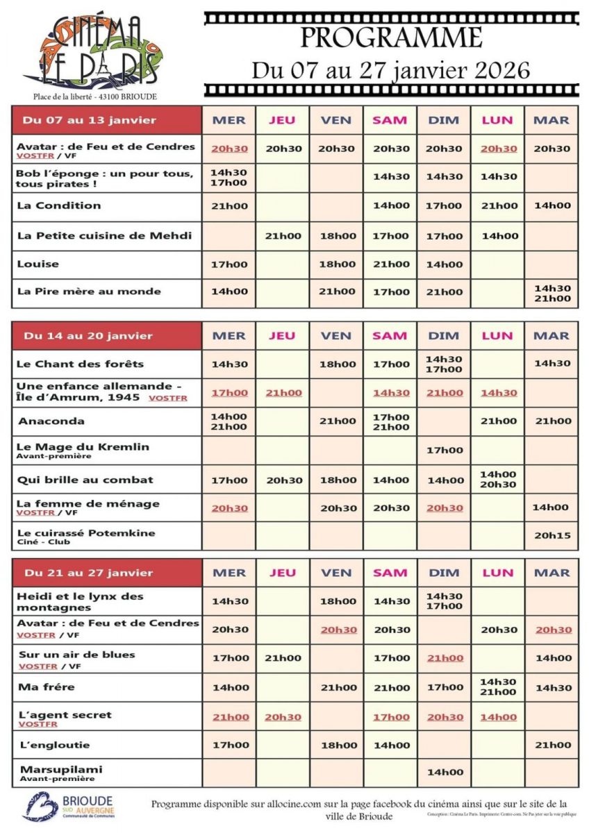Programme du Cinéma Le Paris pour la période du 17 décembre 2025 au 6 janvier 2026.