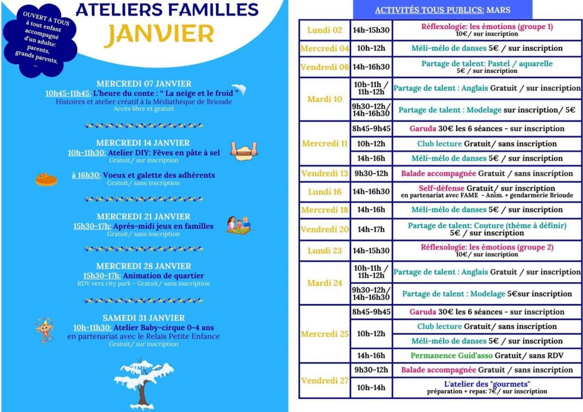 De nombreuses activités sont proposées à tous que ce soit les adultes ou les enfants en passant par les familles ainsi que des services pour les associations. Il y en a pour tous les goûts: sportives, culturelles, ateliers créatifs, partage de talent, balades...