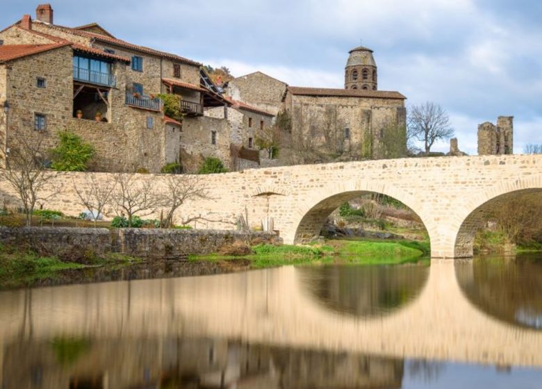 Juste avant le pont sur la Senouire, tourner à gauche pour emprunter le vieux pont en pierre [> construit au xve siècle pour accéder au château]. Sur l’autre rive, prendre à droite et continuer en direction de Blannat. Atteindre un passage à niveau.