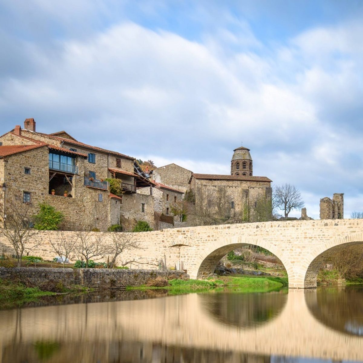 Passer sous une arche, le « Portail bas ». Aller ensuite tout droit pour déboucher sur une place. Au bout de la place, descendre par la rue à gauche. Plus bas, arriver sur une autre rue. Tourner à gauche pour emprunter le pont en pierre sur la Senouire. Continuer sur la route