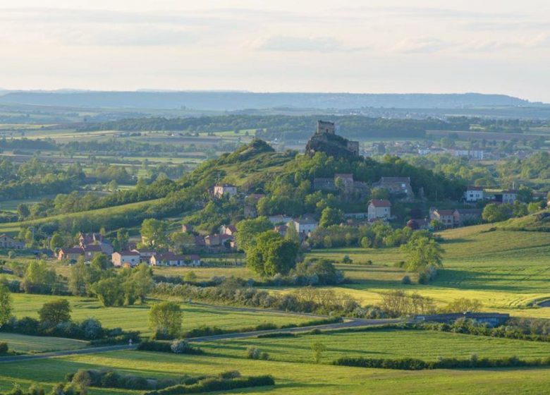 Emprunter à droite un chemin [O> vue sur les monts du Livradois- Forez et les ruines du château de Laroche]. Au T avec la route, obliquer à droite sur quelques mètres, puis reprendre un chemin à gauche qui