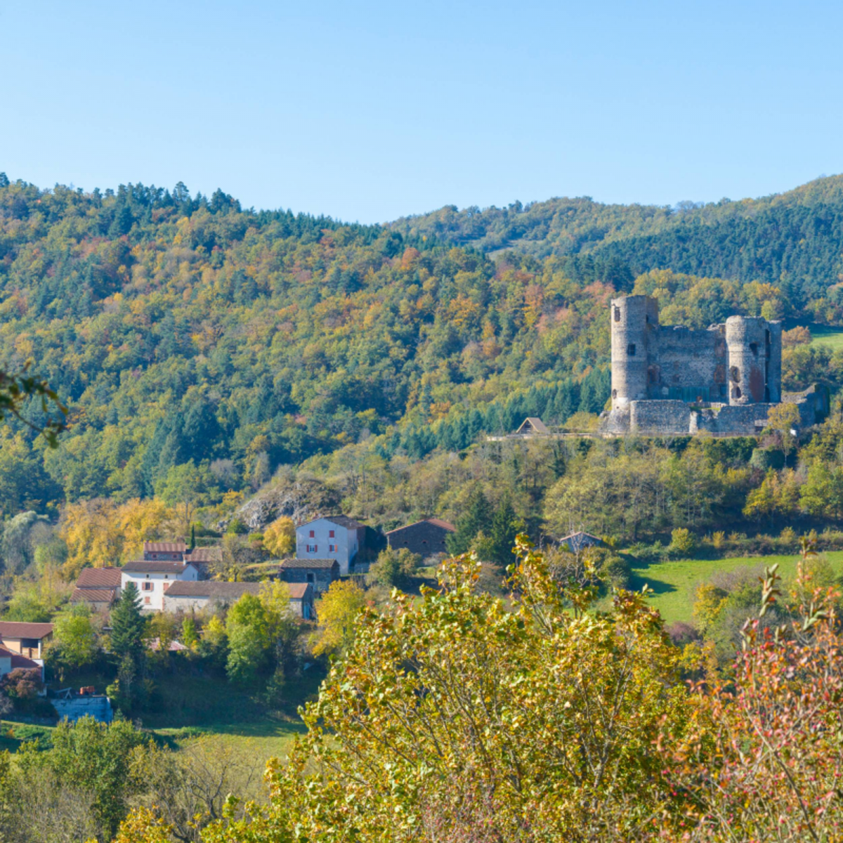 à gauche vers le château [O]. À la route, poursuivre tout droit 150 m, puis descendre à droite. Plus bas, tourner à gauche.