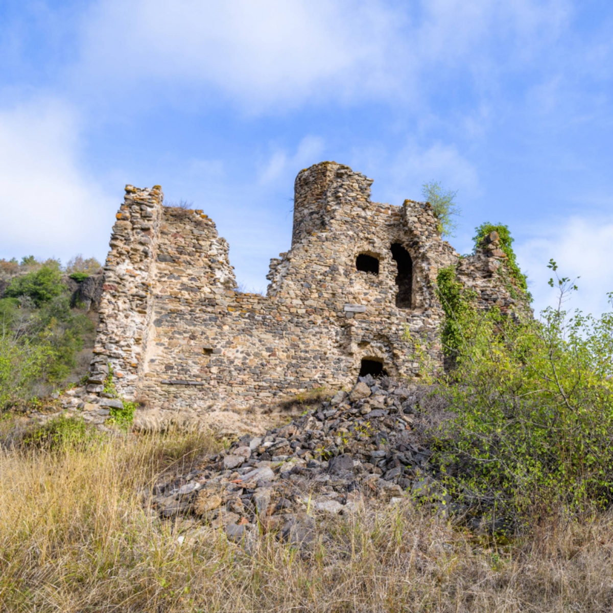 Monter à droite par le chemin du Château [O> ruines du château de Montgon (XIIIe siècle). Vue sur le viaduc de la Violette qui enjambe la vallée]. Emprunter le sentier qui passe en contrebas d’une maison et