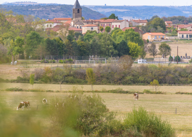 Emprunter à droite une piste. À la bifurcation suivante, près d’un plan d’eau, continuer sur la droite. Environ 800 m plus loin, passer sous la D 586 en utilisant un boviduc. Dans le prolongement, emprunter la route pour repasser sous l’autoroute et rejoindre Boisseuges [O> four banal, croix de Blesle]. Traverser le hameau en prenant toujours tout droit.