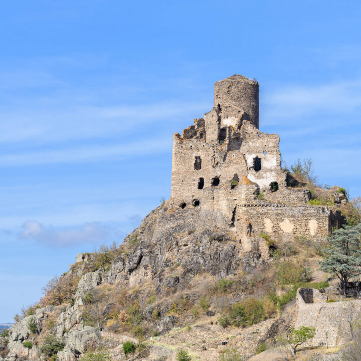 après le four en empruntant le chemin des terrasses. Monter l’escalier pour arriver au bas du château [O> vue sur les vestiges du château