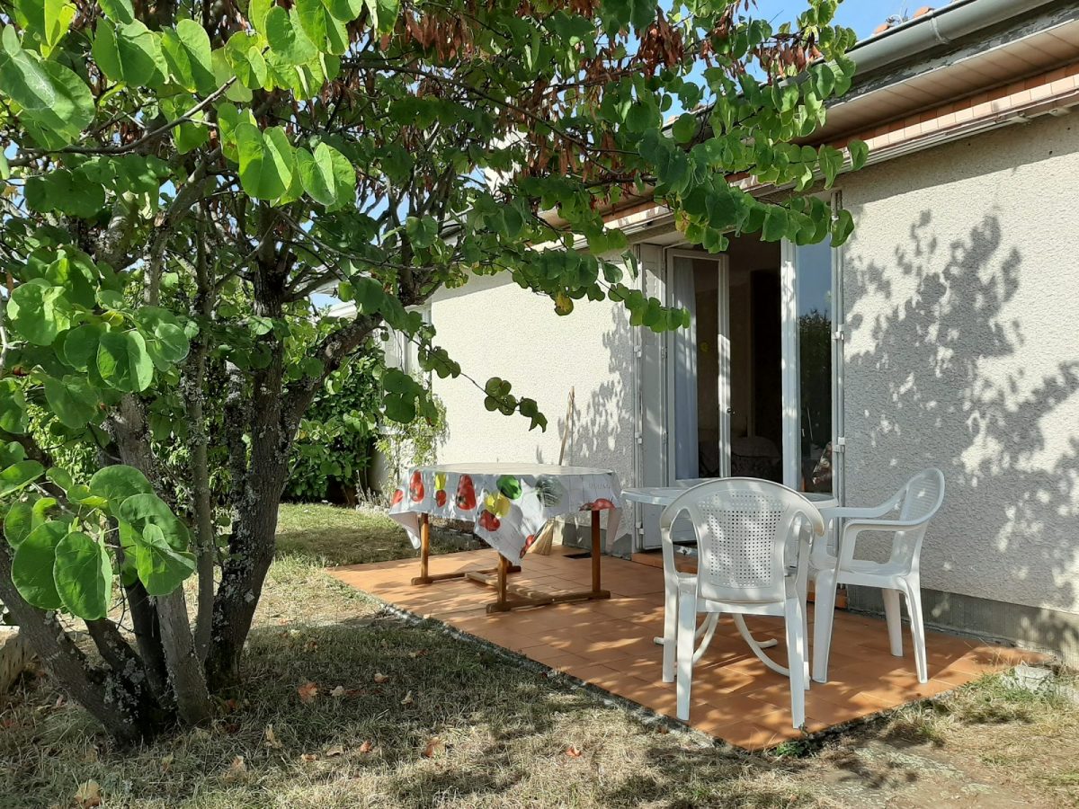 Terrasse aménagée avec mobilier de jardin. Store banne. Barbecue (charbon de bois).