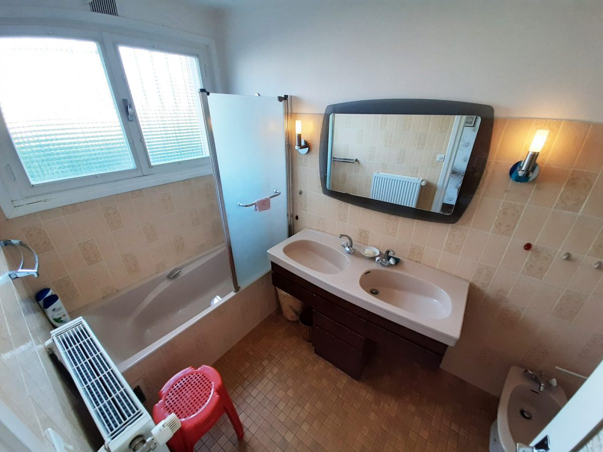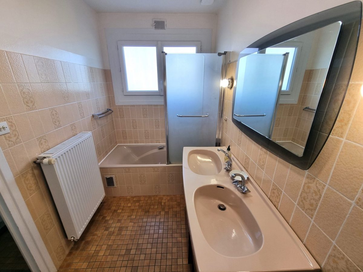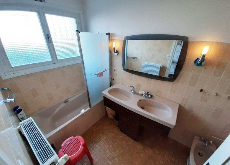 → Salle de bains : baignoire avec pare-douche, 2 vasques sur meuble, bidet, sèche-cheveux, fenêtre, VMC, ...