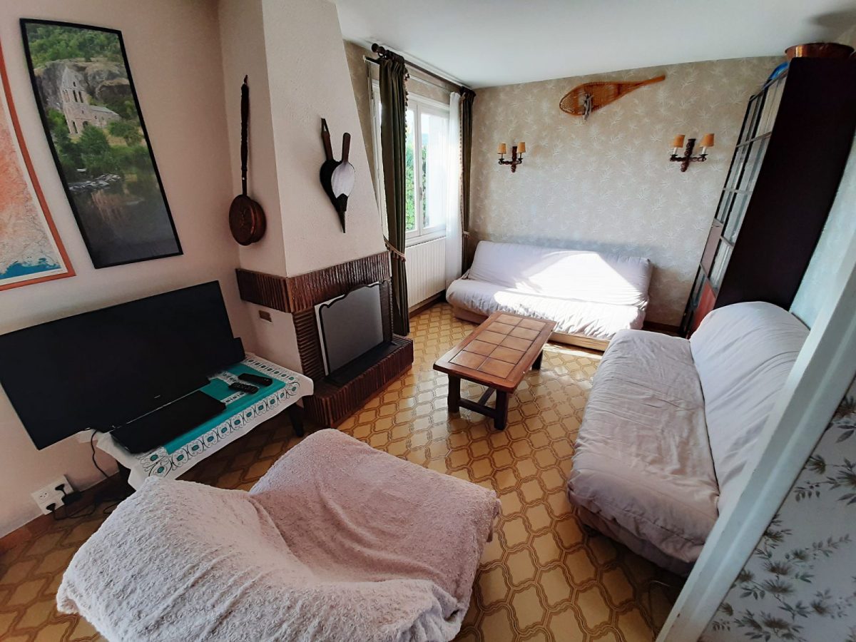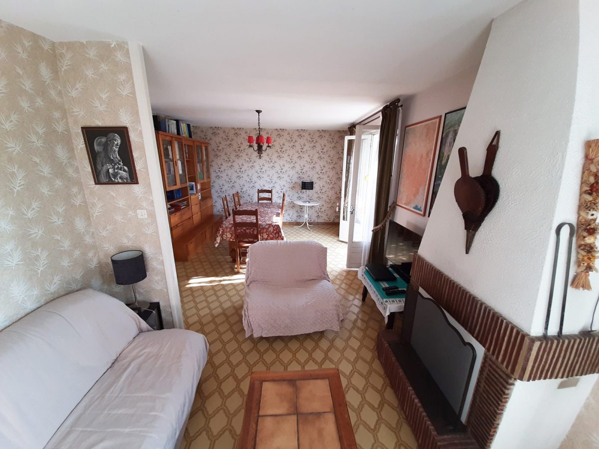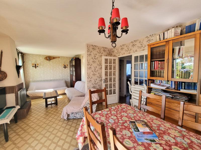 → Séjour-salle à manger avec cheminée décorative, porte-fenêtre ouvrant sur la terrasse aménagée et le jardin clos et arboré.