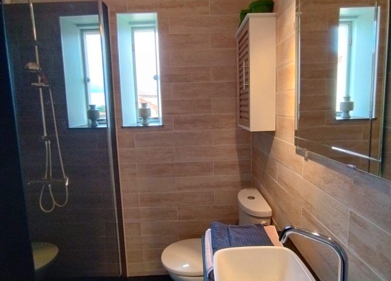 Étage : 1 chambre 2 pers. (1 lit en 160x200 cm), salle d'eau avec douche grand format, vasque sur meuble et WC.