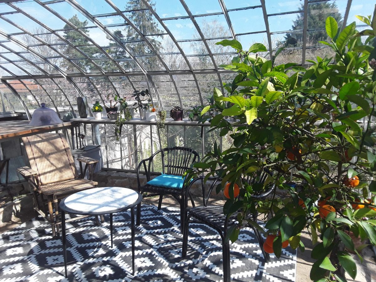 Terrasse privative avec mobilier de jardin et chaises longues. Serre privative à la location. Terrain clos commun, ombragé et fleuri. Local à vélos/motos. Brioude terre d'enduro: motards bienvenus. Parking à proximité immédiate.