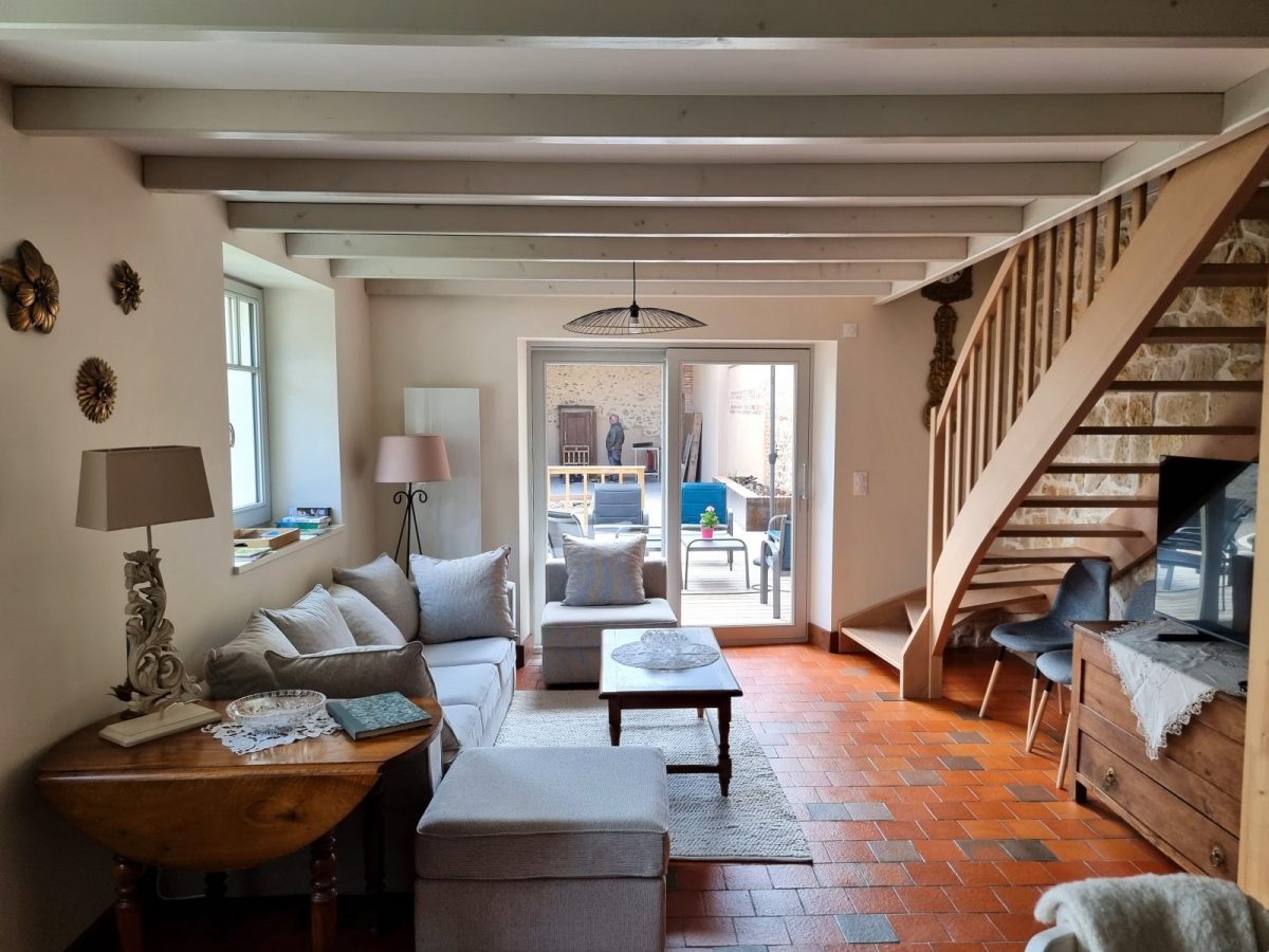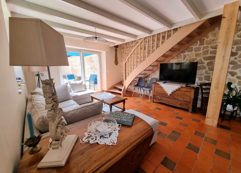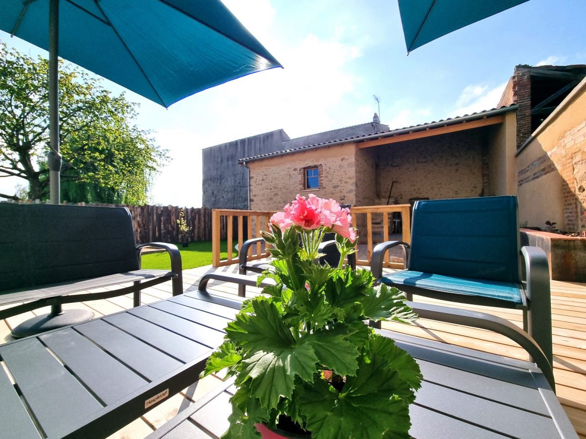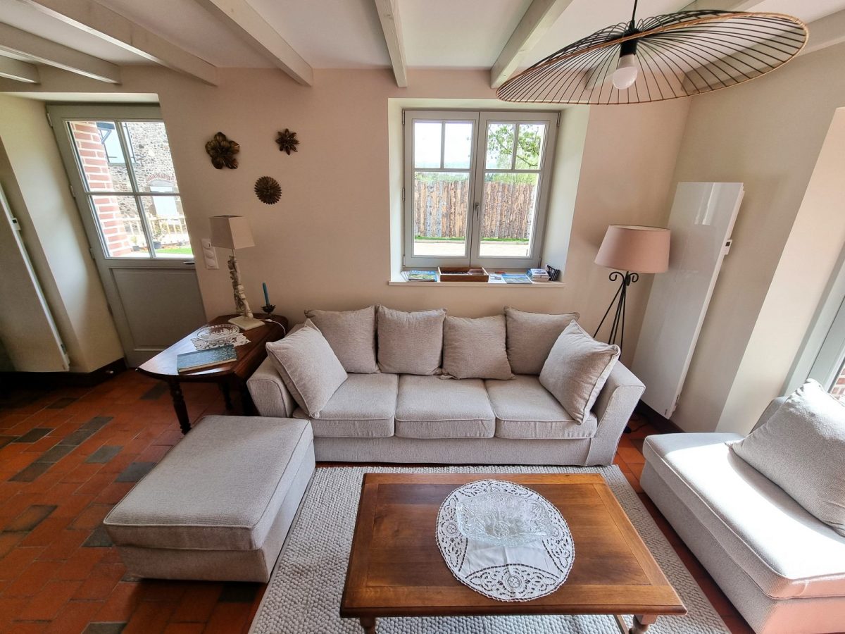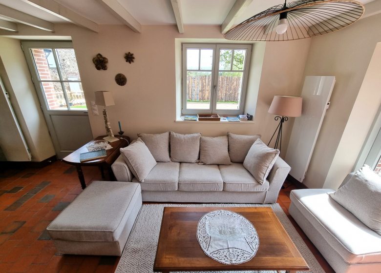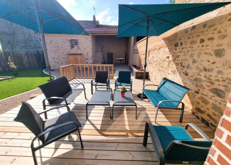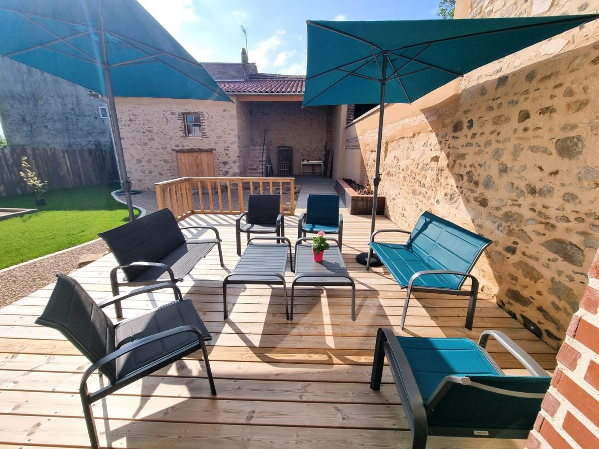 Le coin salon dispose d’un accès direct sur la terrasse joliment aménagée (40 m2) : salon de jardin (canapés, fauteuils, tables basses, parasols, …) et prolongement sur la cuisine d’été (abri avec barbecue, tables et chaises de jardin, …