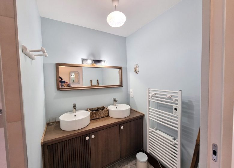 → Salle d’eau avec douche, vasque sur meuble, sèche-cheveux, produit d’accueil (gel douche corps et cheveux), sèche-serviettes électrique, VMC, …