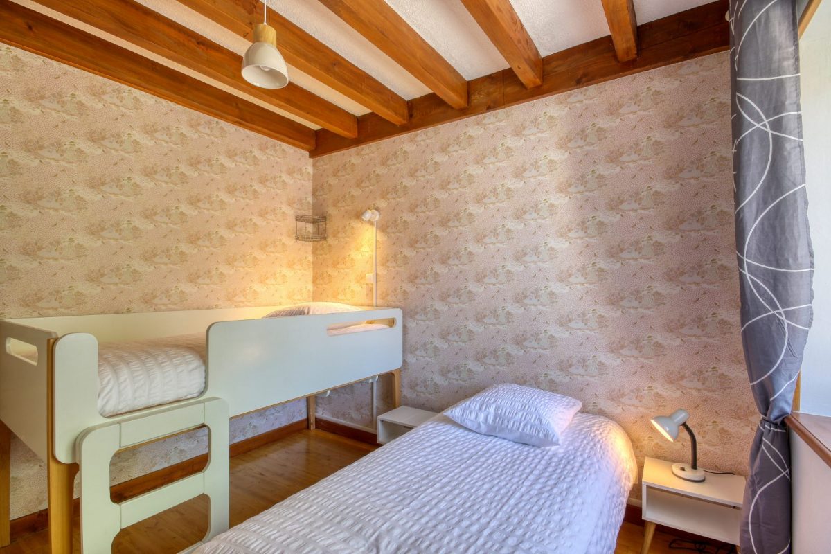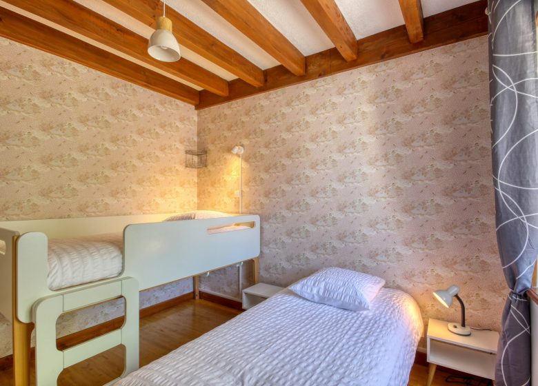 - Chambre 1 : 2 lits 1 pers. en 90x190 cm dont 1 lit mezzanine avec échelle, placard mural (rayonnages et penderie avec cintres).