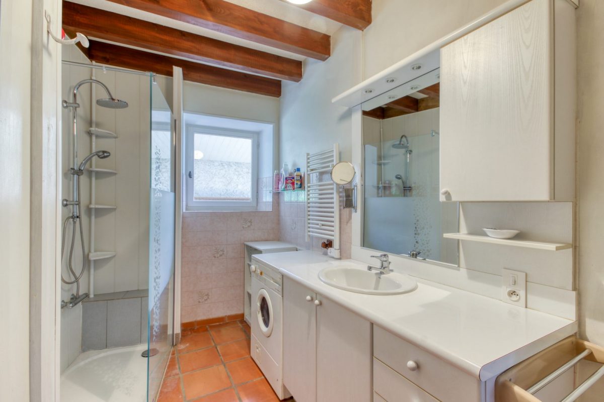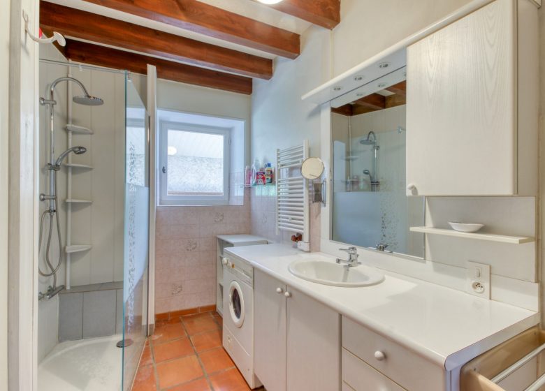 Salle d’eau avec douche à l’italienne grand format, pare-douche, colonne de douche avec douchette et pommeau, vasque sur meuble, nombreux rangements, meuble de salle de bains, sèche-cheveux, sèche-serviettes, fenêtre, …