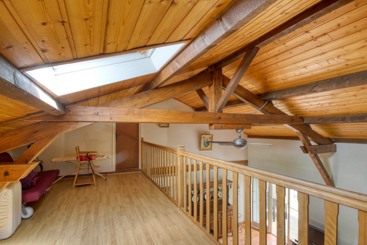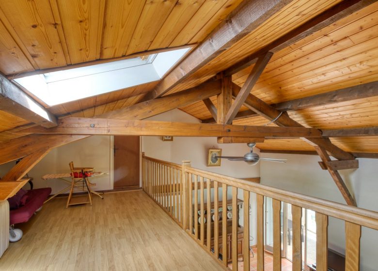 Mezzanine avec bureau et chaise, livres, … coin repassage (table et fer à repasser), et BZ pour un couchage d’appoint.