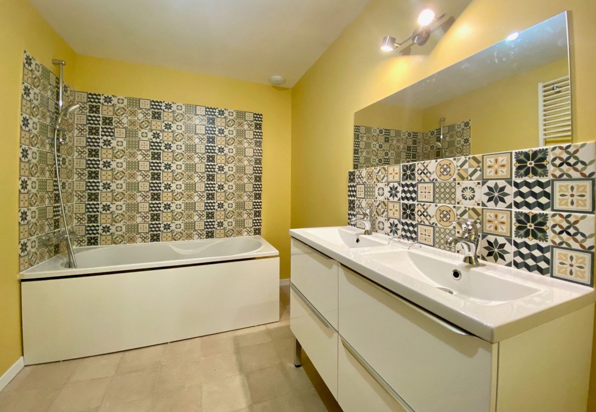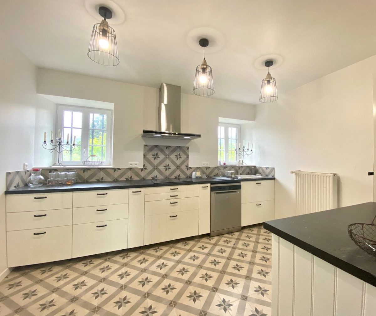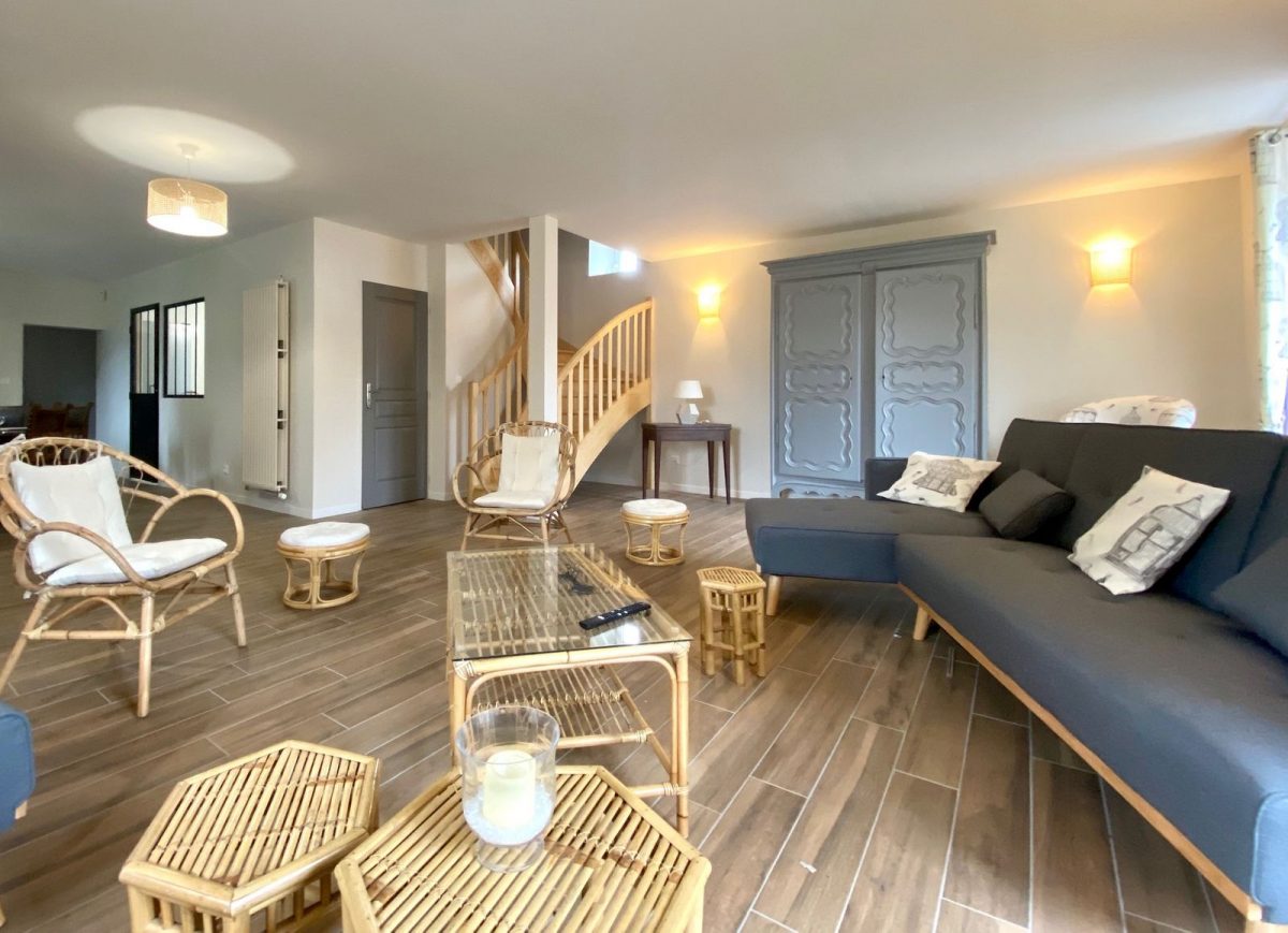 Au rez-de-chaussée : un séjour/salon avec des grands volumes, une cuisine équipée (plaque induction, lave vaisselle, robot), un WC indépendant, un cellier avec lave linge.
