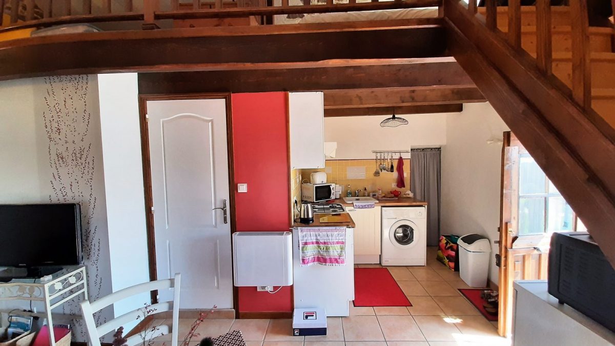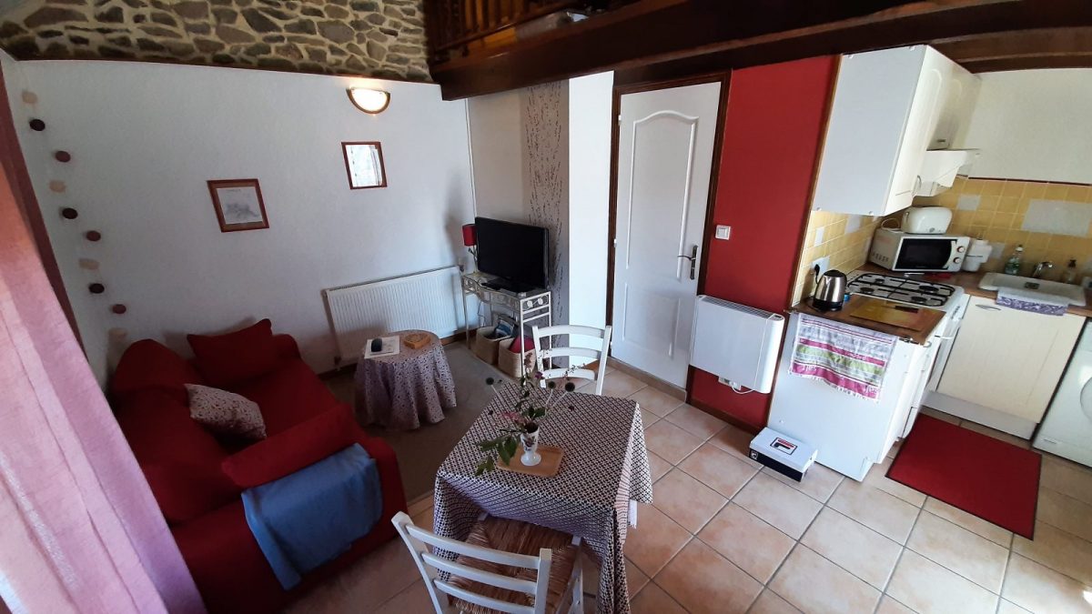 Accès au logement par une terrasse privée et surélevée : pièce à vivre avec coin cuisine (évier, hotte aspirante, gazinière avec 4 feux gaz et four gaz, mini four électrique, four à micro-ondes, cafetière, bouilloire, grille-pain, vaisselle, table et chaises assorties, ustensiles et batterie de cuisine,...) coin salon avec canapé, TV à écran plat, TNT, WIFI (connexion gratuite et sécurisée),...
