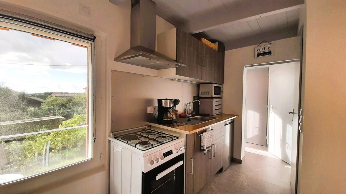 Pièce de vie avec cuisine équipée : évier, hotte aspirante, cuisinière avec four électrique, 3 feux gaz et plaque électrique, four à micro-ondes, réfrigérateur table top avec compartiment congélateur, cafetière électrique avec filtre jetable, bouilloire électrique, grille-pain, petits appareils électroménagers (pied mixeur, mini hachoir électrique, …), vaisselle, ustensiles et batterie de cuisine, … Table et chaises assorties.