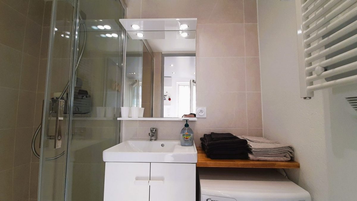 Salle d’eau avec vasque sur meuble, douche grand format avec portes vitrées, sèche serviette électrique, VMC, sèche-cheveux, produits d’accueil (gel douche, shampooing, …), lave-linge, patères, …