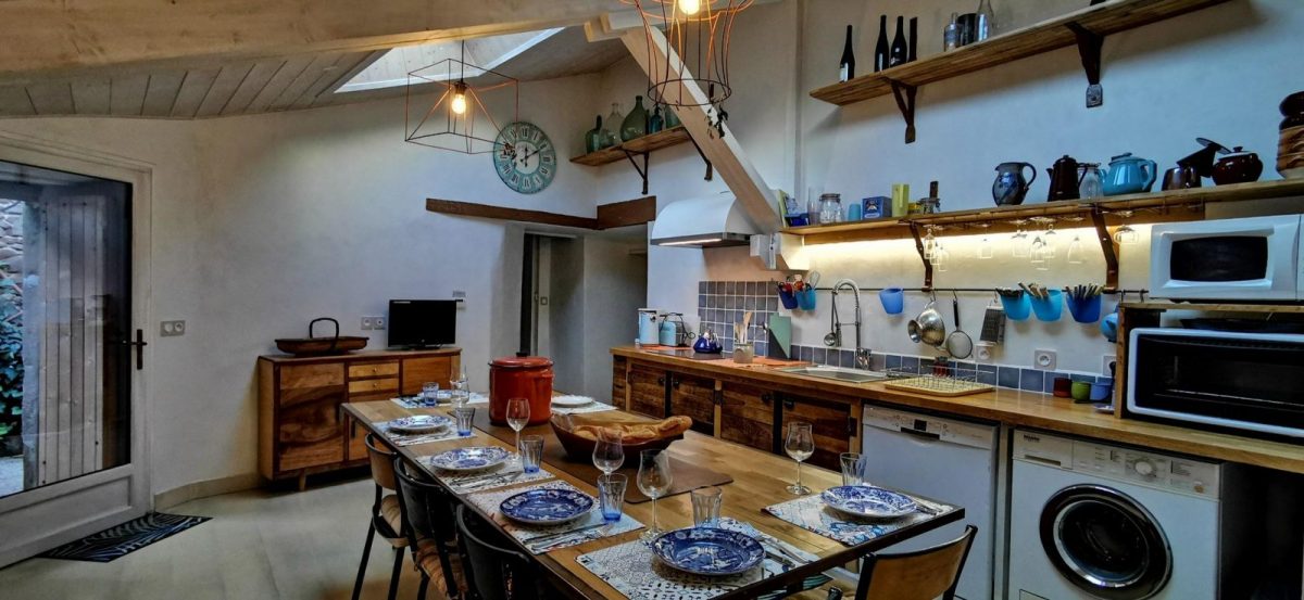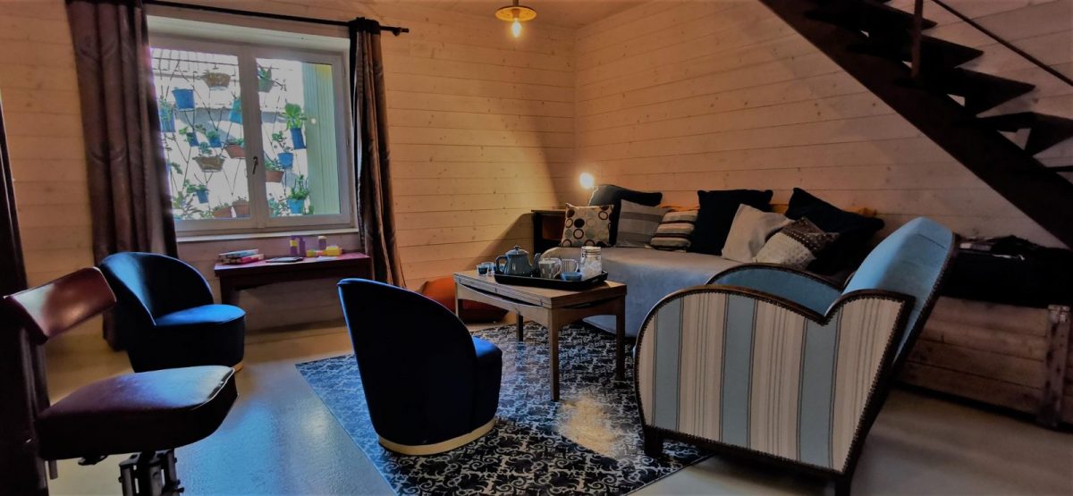 En poussant la porte d'entrée, vous découvrirez un gîte à la décoration soignée alliant bois et métal pour une ambiance cosy.