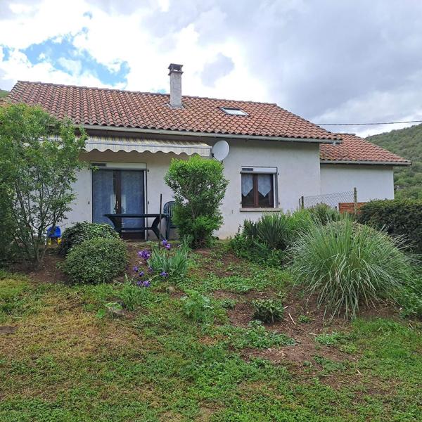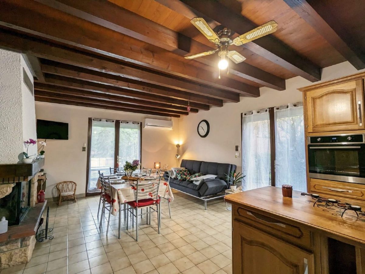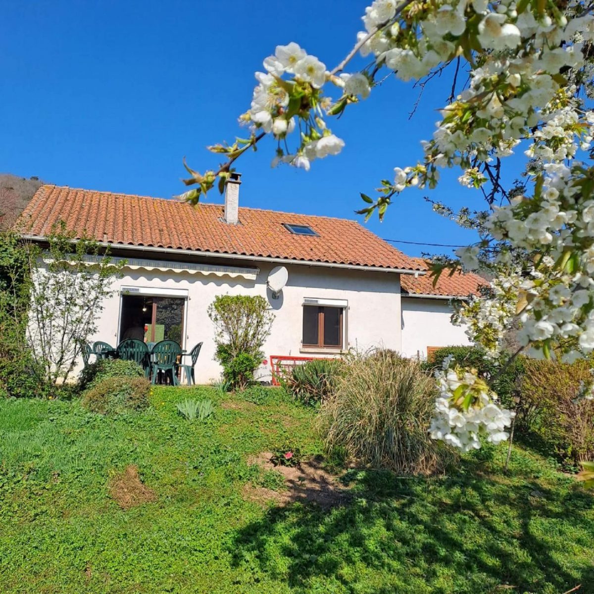 Sur un terrain entièrement clos, fleuri et arboré, l'entrée de la maison se fait de plain pied, sur la pièce principale ouvrant sur la terrasse.