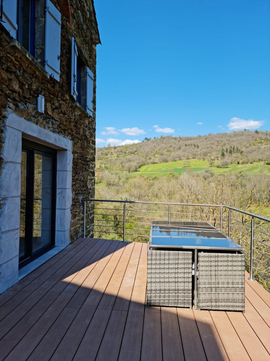 Terrasse en bois composite surélevée et sécurisée avec salon de jardin (grande table avec 8 fauteuils coordonnées, parasol autoporté, … depuis la terrasse, vue panoramique sur la campagne et la rivière en contrebas !