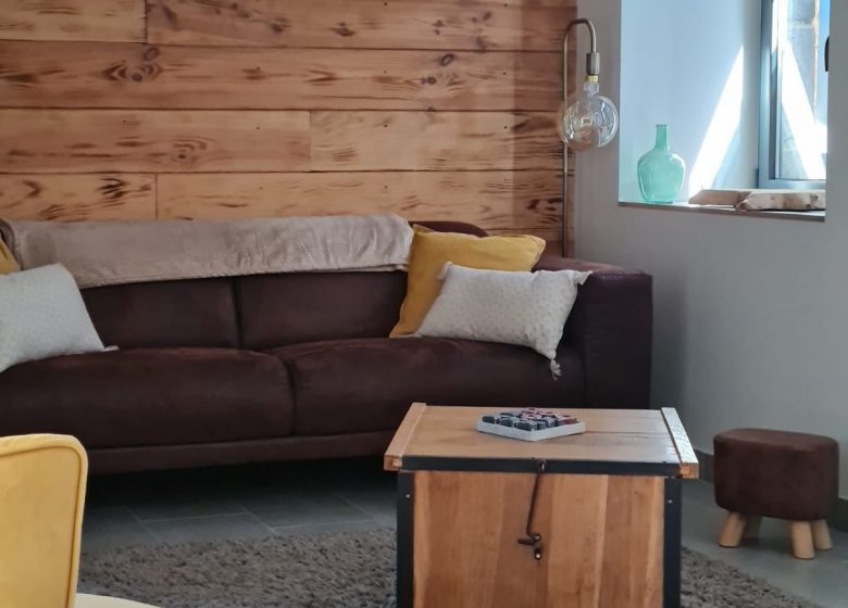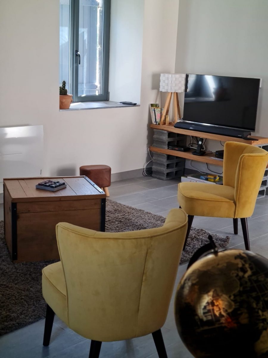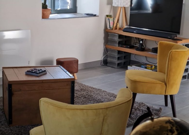 Canapé, fauteuils, table basse, TV couleur à écran plat équipée d’une barre de son et enceinte, TNT, box internet privative avec ligne téléphonique et WIFI (connexion gratuite et sécurisée), …