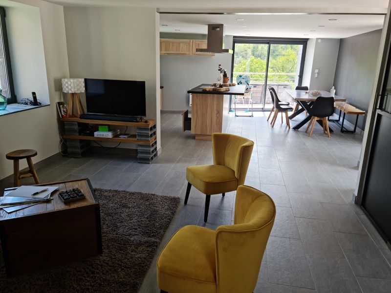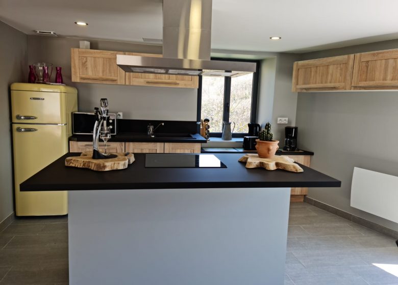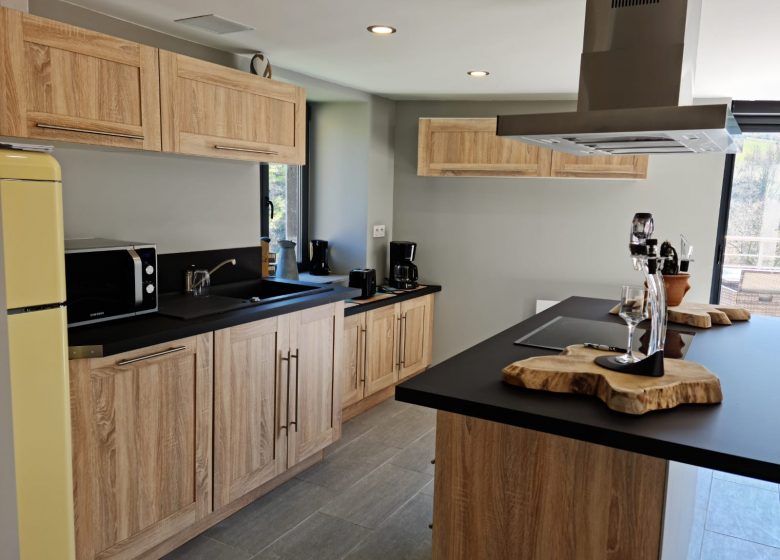 Rez-de-chaussée : grande pièce à vivre lumineuse avec baie vitrée ouvrant sur la terrasse : cuisine entièrement équipée : îlot central avec table à induction 3 foyers et four électrique, hotte aspirante, four à micro-ondes, lave-vaisselle, réfrigérateur avec congélateur, cafetière, bouilloire, grille-pain, vaisselle, ustensiles et batterie de cuisine, …