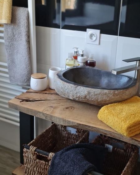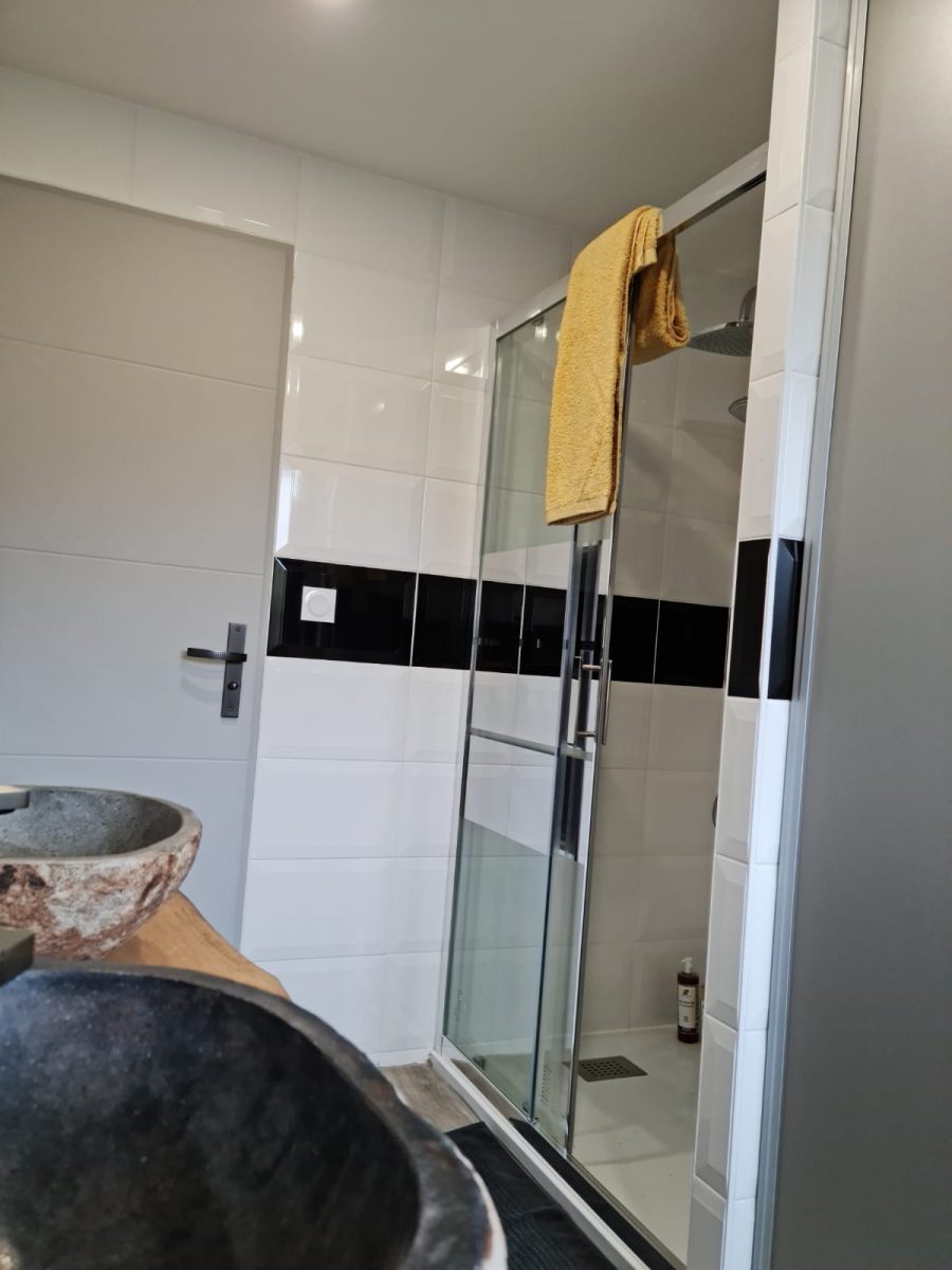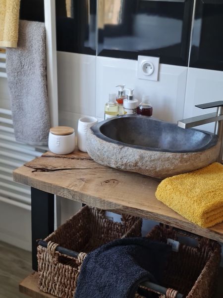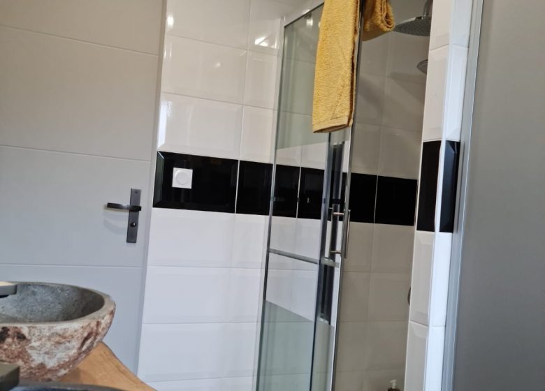 Salle d’eau avec douche grand format, 2 vasques sur plan meuble, radiateur électrique sèche-serviettes, sèche-cheveux, placard mural, produits cosmétiques* bio et locaux (gel douche, shampooing, lait pour le corps …, * du laboratoire Cosmétosource).