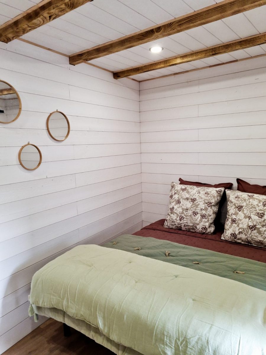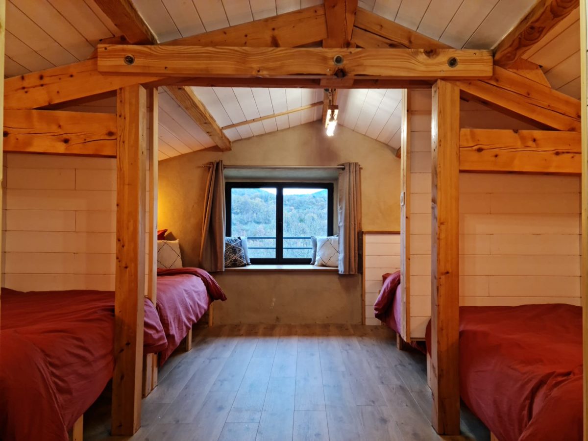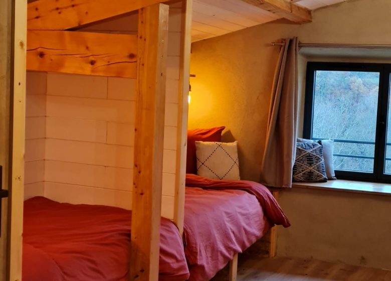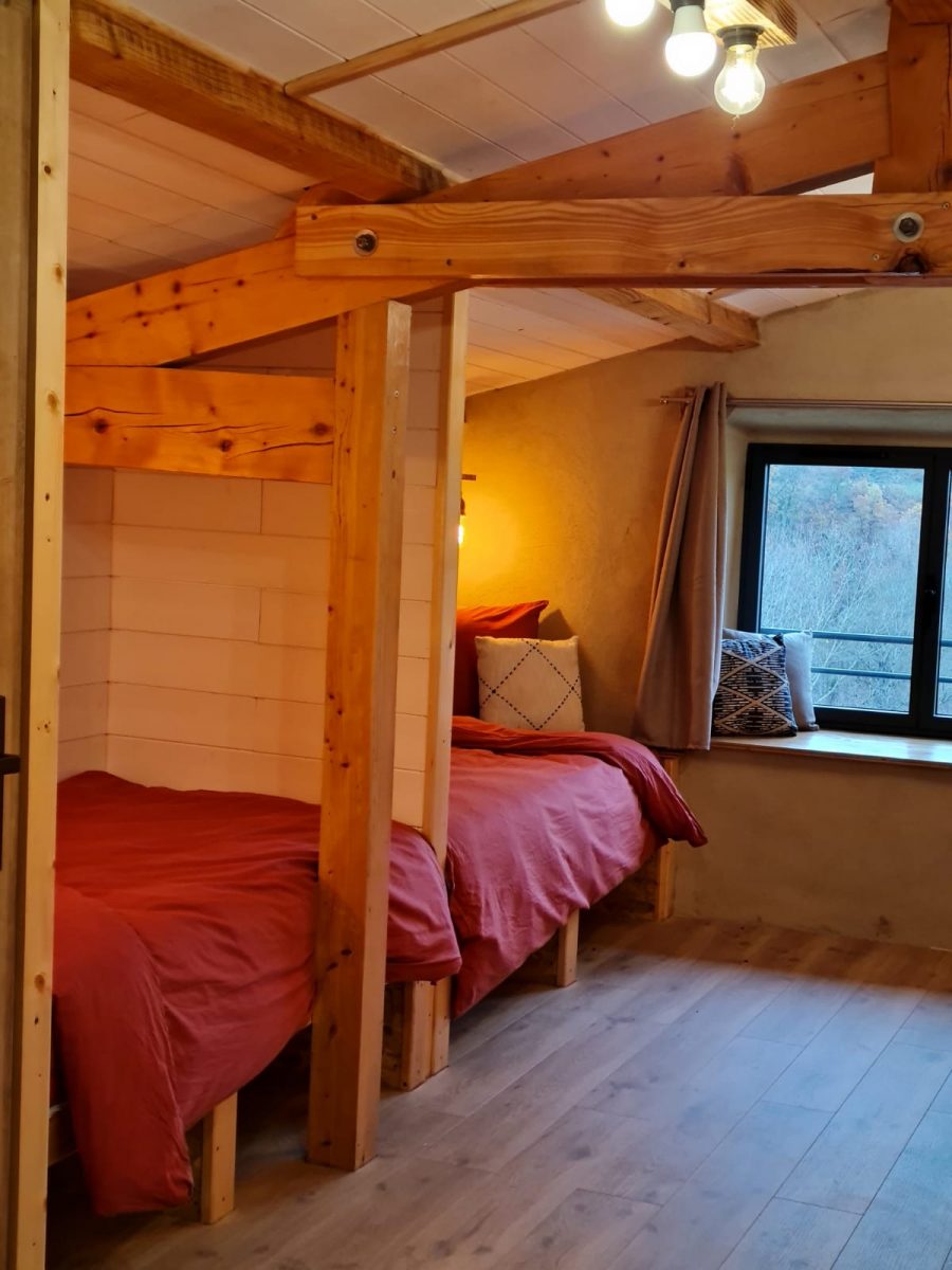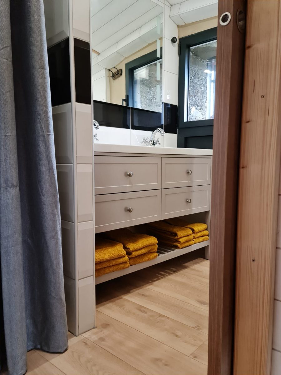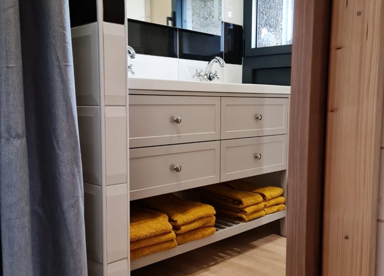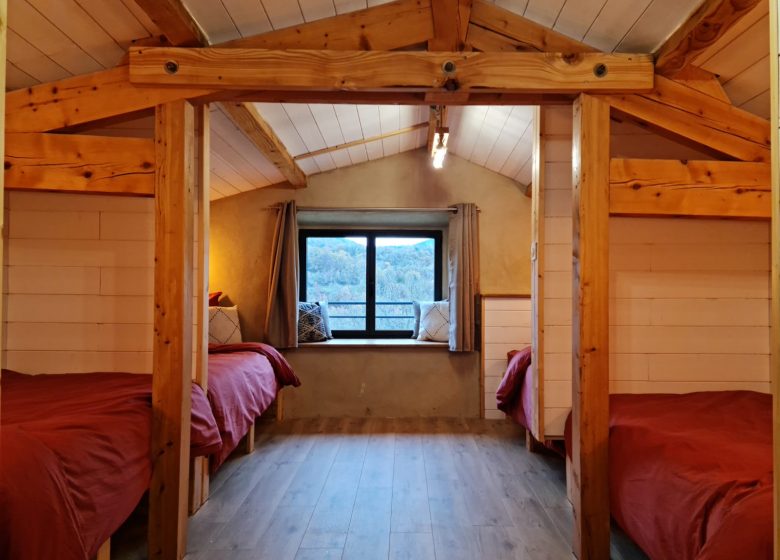 Au dernier étage un dortoir (4 couchages) avec lit 90x190 cm avec rangement sous les lits + un placard intégré + un toilette + 1 salle de bain avec meuble vasque 2 places et une grande douche