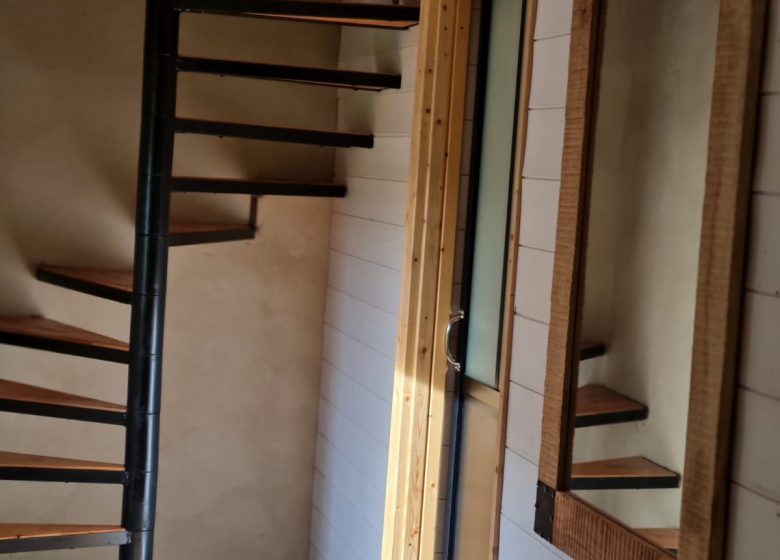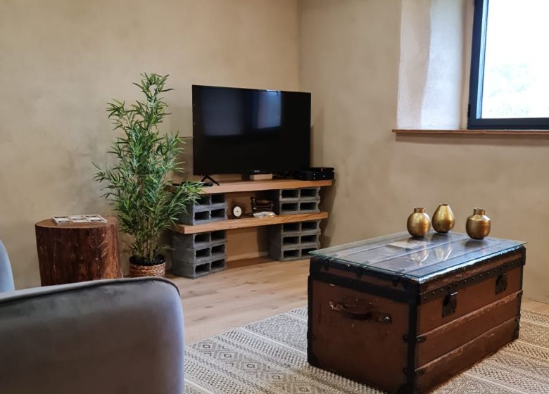 Au 1er étage : salon avec un canapé, TV couleur écran plat, TNT, box internet privative avec ligne téléphonique et WIFI (connexion gratuite et sécurisée) + 1 chambre avec 1 lit 2 pers. En 140x200 cm avec placard intégré