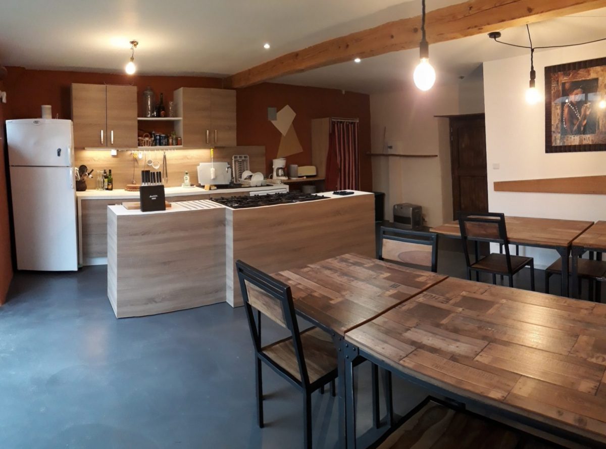 Une cuisine équipée ouverte sur une salle à manger d'environ 35 m². Poêle à bois en fonte.