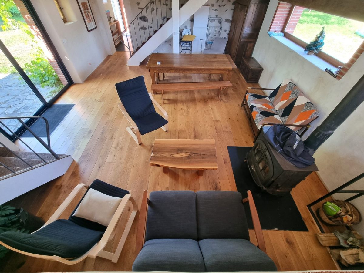 Une grande pièce à vivre de 55 m² sur 2 niveaux (environ 40 m² + 15 m²), fauteuils et canapés, et un poêle à bois. La "partie TV" est située sur le niveau supérieur.