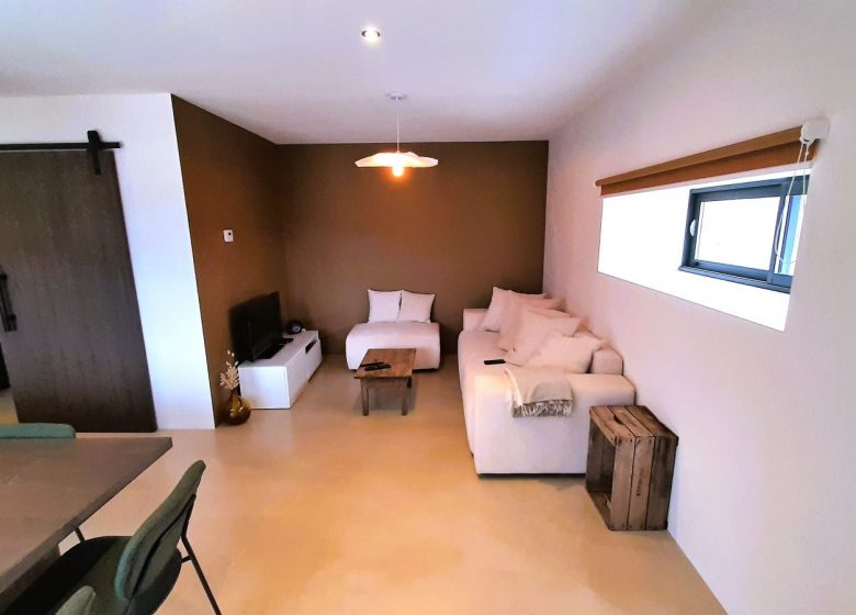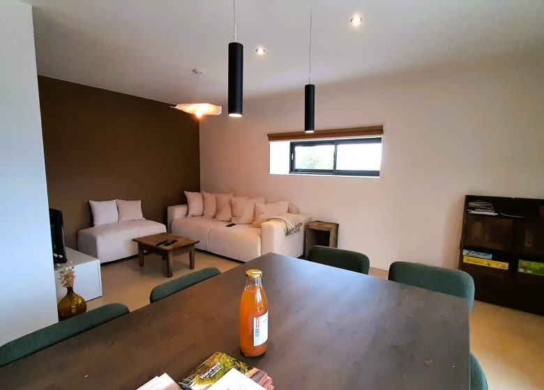 Coin TV avec canapé-convertible en 140x190 cm (2 couchages d’appoint), assise deux places avec coussins, table basse, TV HD avec Orange TV, WIFI (connexion gratuite et sécurisée), jeux de société pour toute la famille, livres tout public dont livres sur la région, magazines, …
