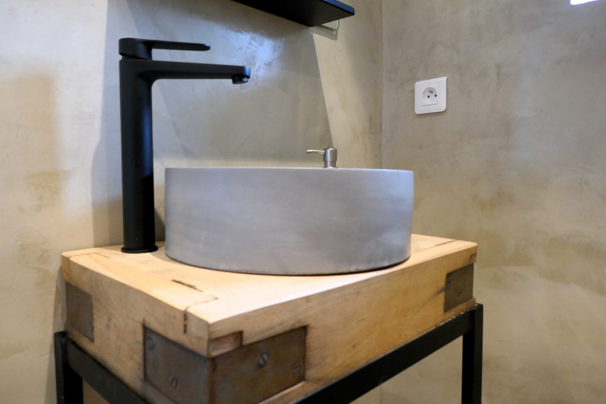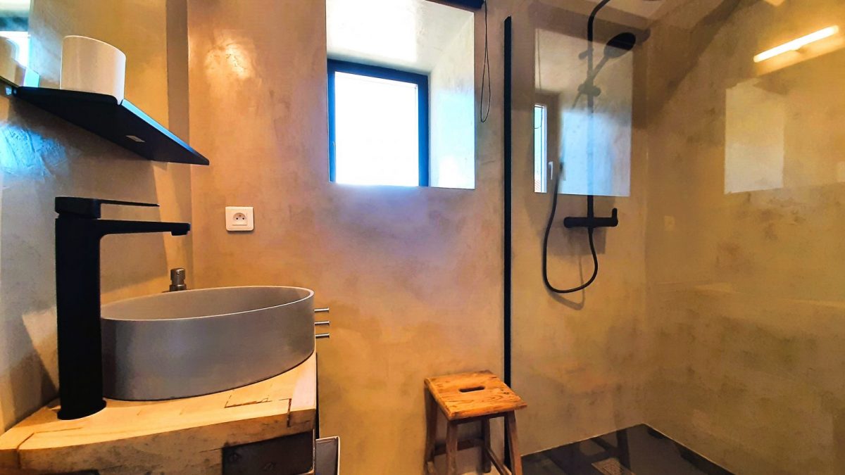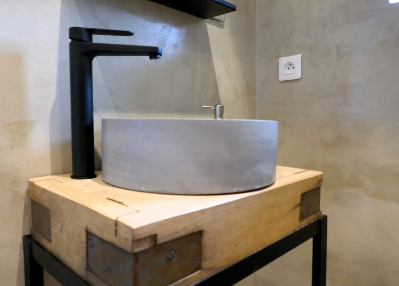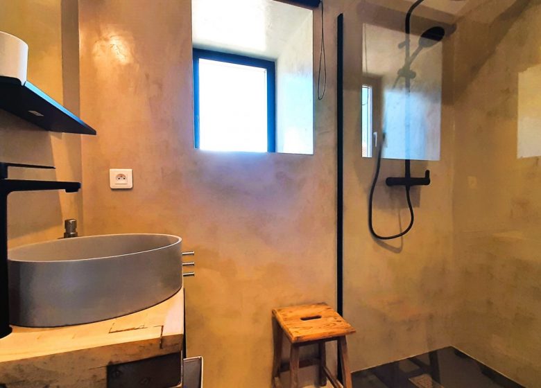 Salle d’eau avec douche à l’italienne grand format, vasque sur meuble, sèche-serviettes électrique, sèche-cheveux, gel douche corps & cheveux 100% naturel, fenêtre, VMC.
